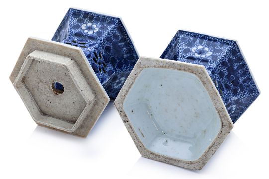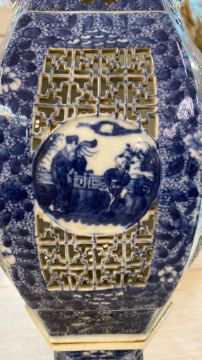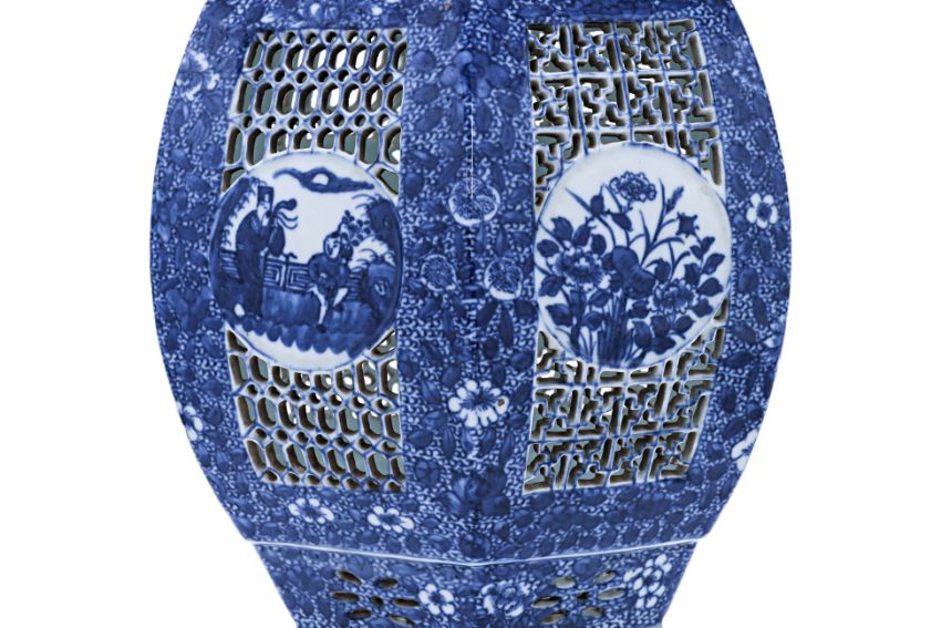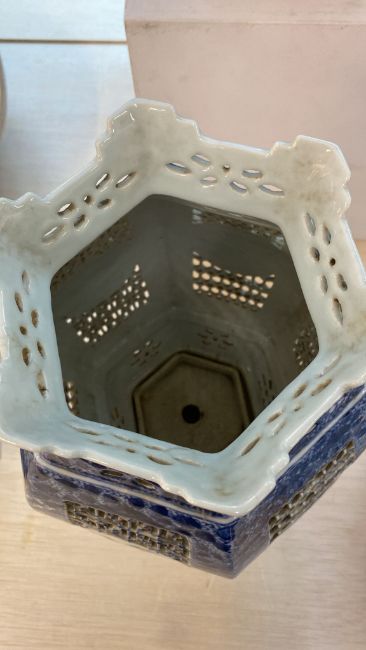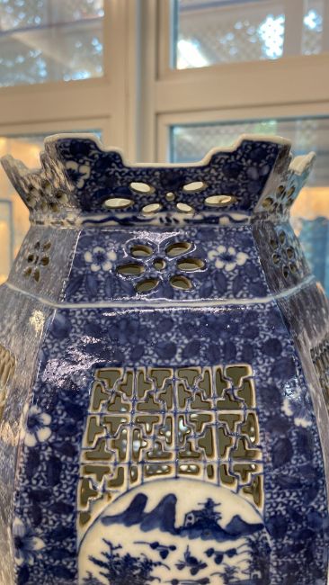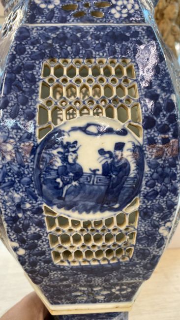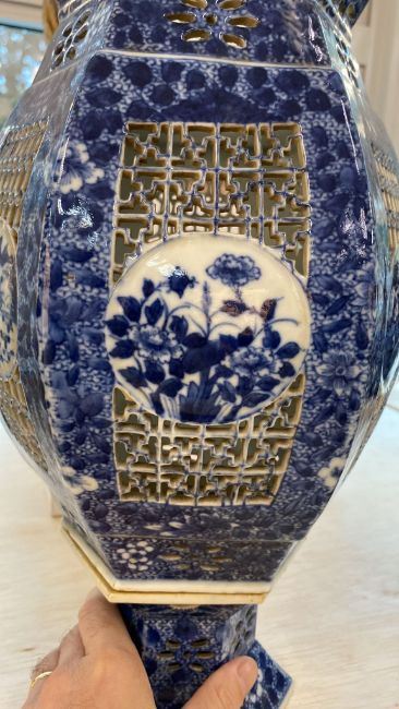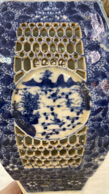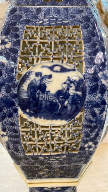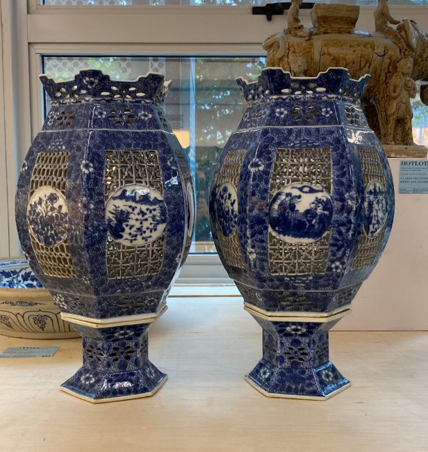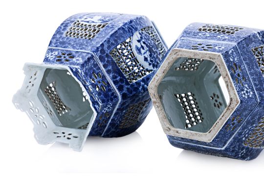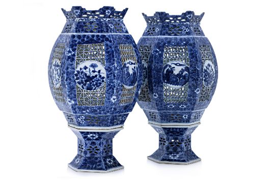 A PAIR OF BLUE AND WHITE RETICULATED PORCELAIN LANTERNS