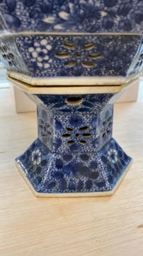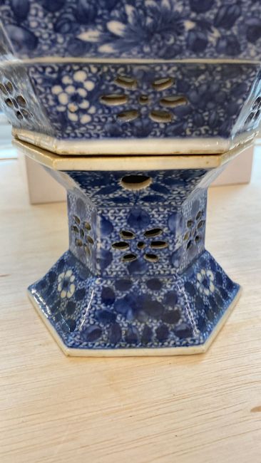 Qing Dynasty, hexagonal with crenelated top, the side panels pierced and decorated with circular reserves of figures, flowering foliage or landscape scenes, on a dense flowering foliate ground, on conforming hexagonal stands