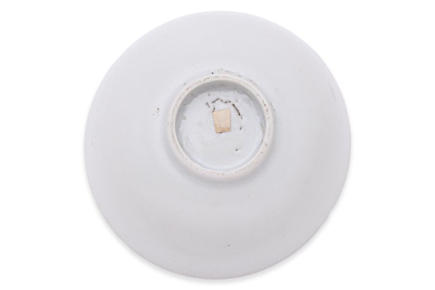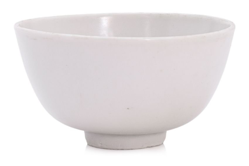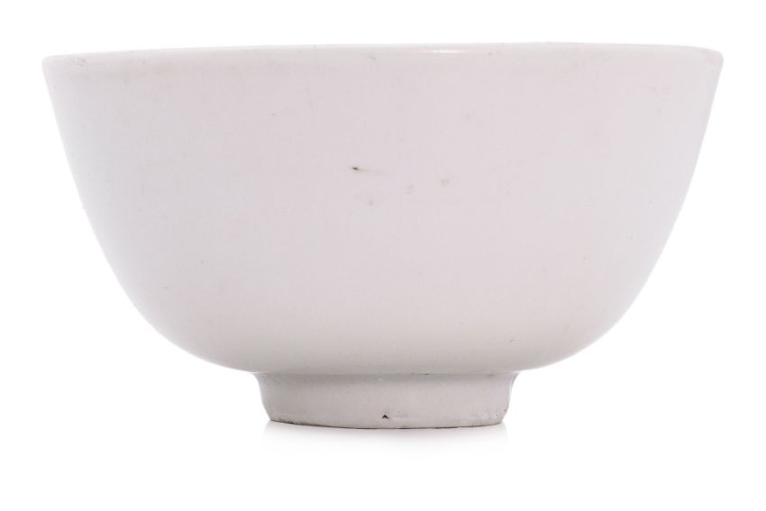 Probably Qing Dynasty, decorated to the interior with scrolling flowers and foliage, the rounded bowl raised on short tapering foot, covered in a slightly opaque greyish white glaze