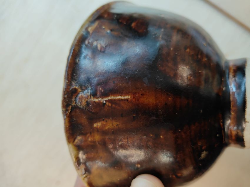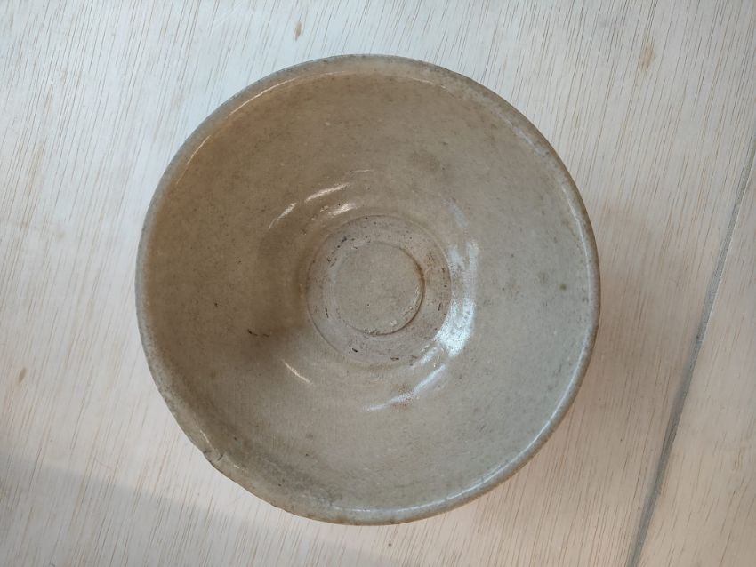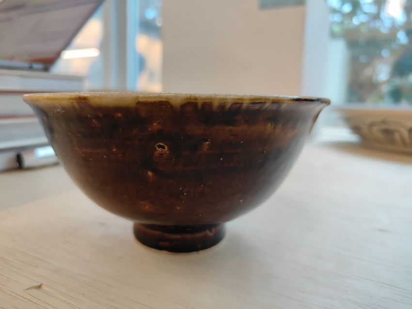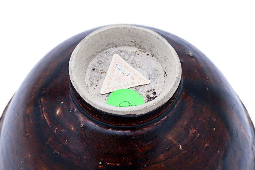 14th Century, dark brown glazed exterior, everted rim and cream white glaze to the interior, the bottom with an unglazed stacking ring, a slightly everted raised foot