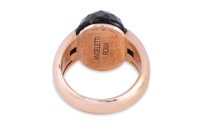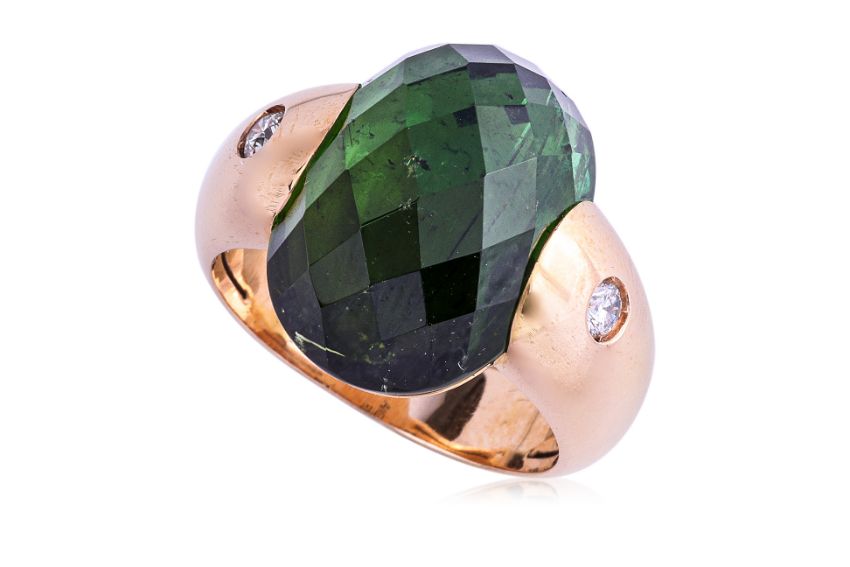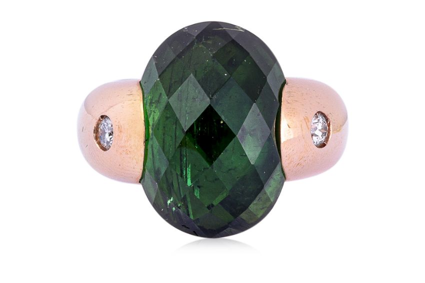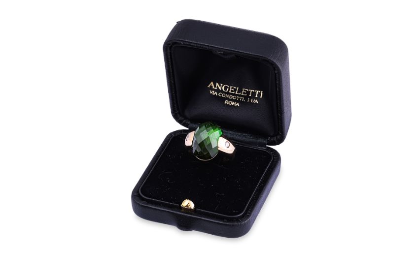 Featuring a faceted cabochon green tourmaline weighing approximately 16.0 Cts, mounted in a gold setting marked '750' for 18K, accented with two round brilliant cut diamonds totalling approximately 0.16 Cts, signed 'Angeletti Roma' to the back. Acccompanied with a ring box by Angeletti, Roma.