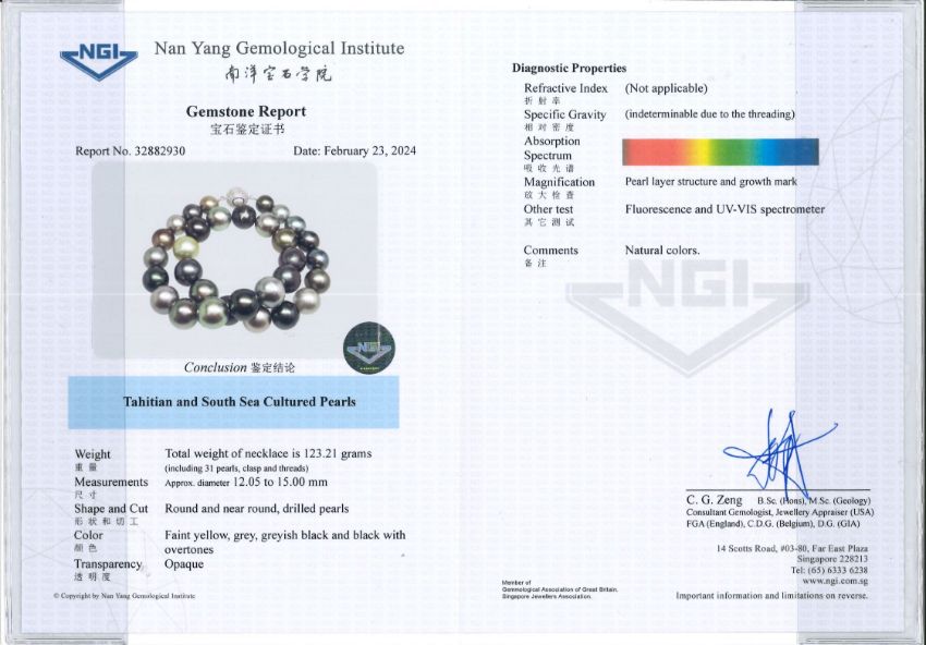 Accompanied with report no. 32882930 by Nan Yang Gemological Institute, dated Feb 23, 2024, stating that the south sea and Tahitian cultured pearls are round, near round and of natural colours.