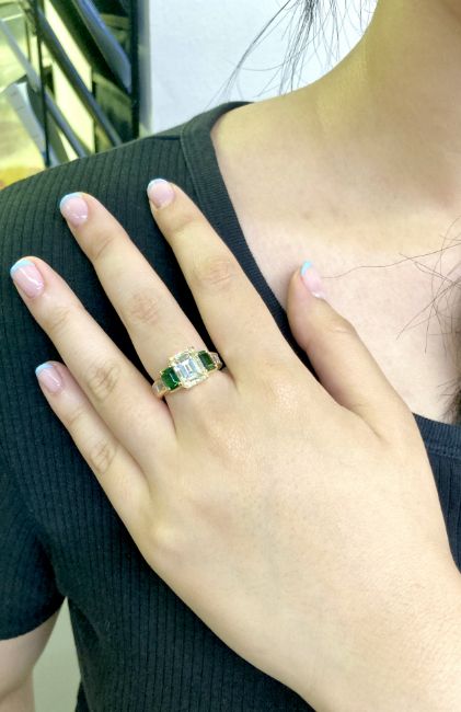Featuring an emerald cut diamond weighing approximately 4.01 Cts, mounted in a yellow gold setting marked 'K18' for 18K, flanked by two tsavorite garnets weighing approximately 1.00 Cts each, accented with baguette cut diamonds totalling approximately 0.50 Cts.