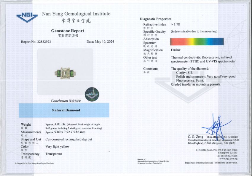 Accompanied with report no. 32882923 by Nan Yang Gemological Institute, dated May 10, 2024, stating that the diamond is of a very light yellow colour, SI1 clarity, and has faint fluorescence.