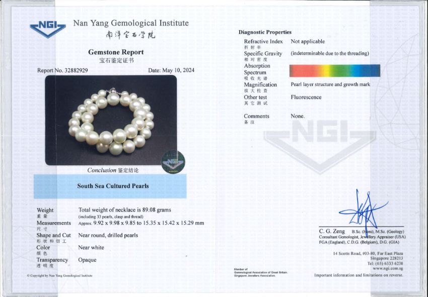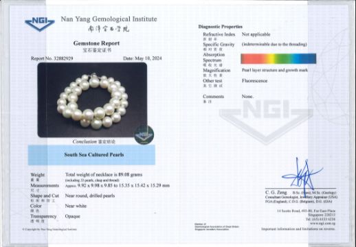 Accompanied with report no. 32882929 by Nan Yang Gemological Institute, dated May 10, 2024, stating that the South Sea cultured pearls are near round and near white.