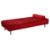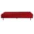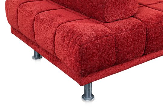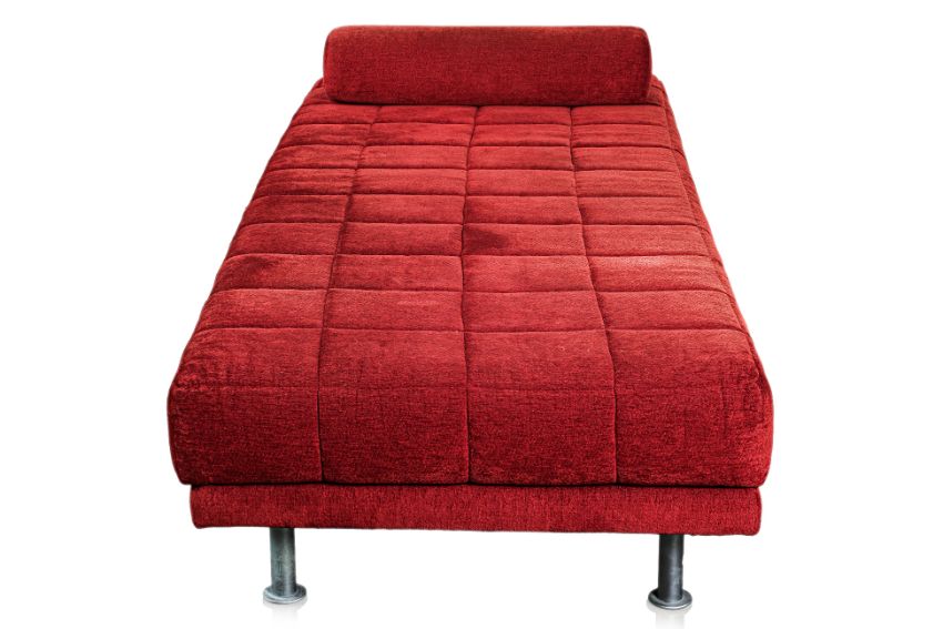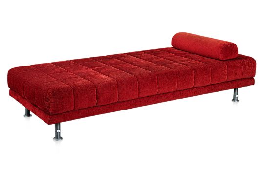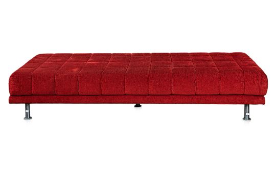 Red toweling fabric upholstery, foam mattress, supported by a steel frame with tubular steel legs