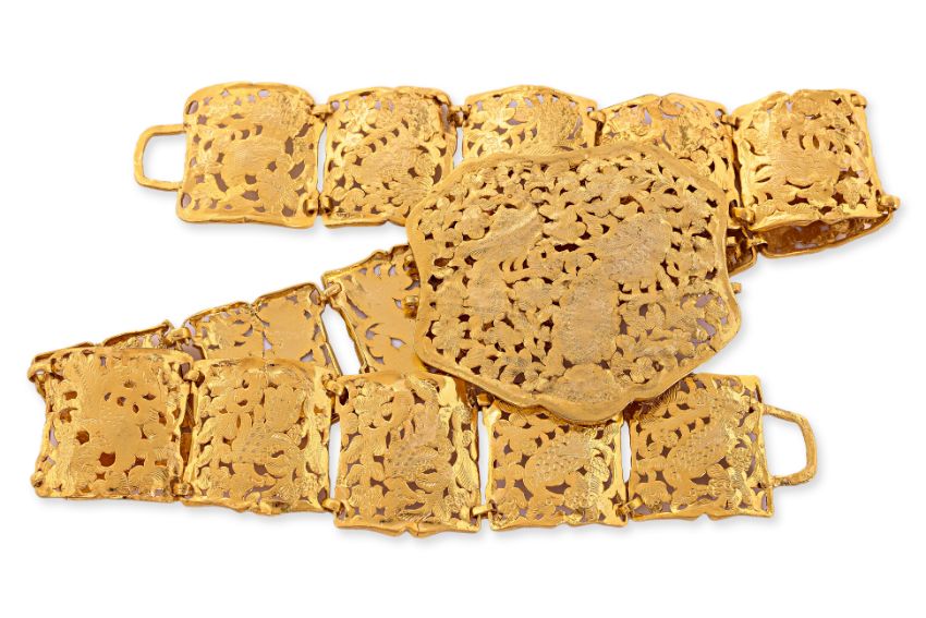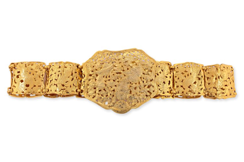 Pierced buckle decorated with two perched phoenix, articulated pierced sections of single phoenix and foliage