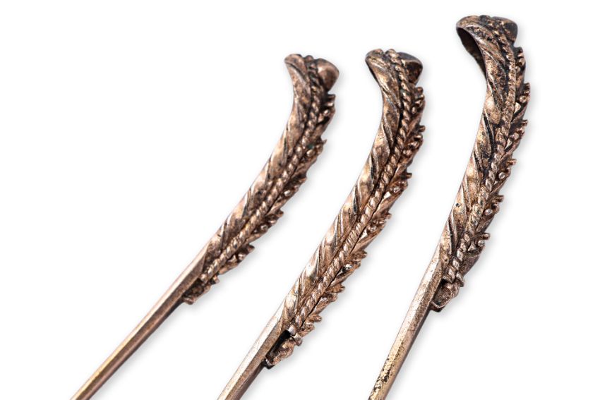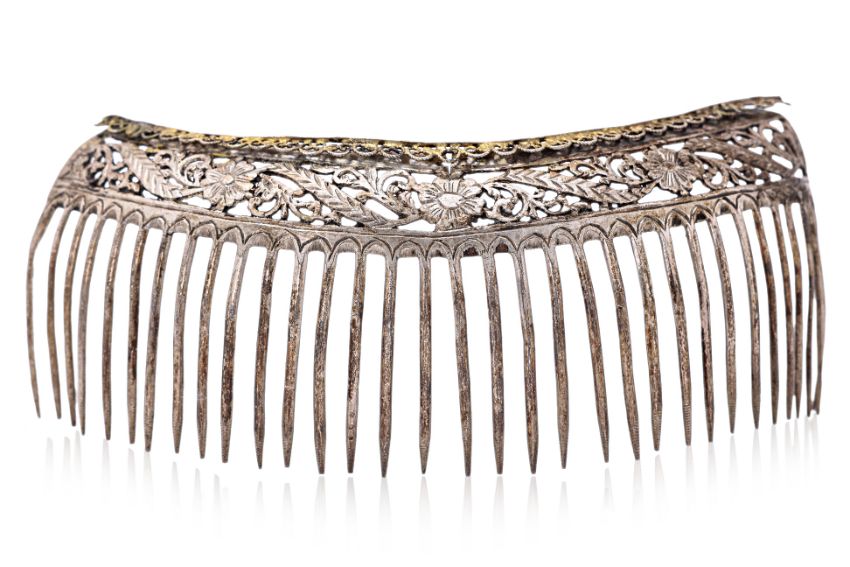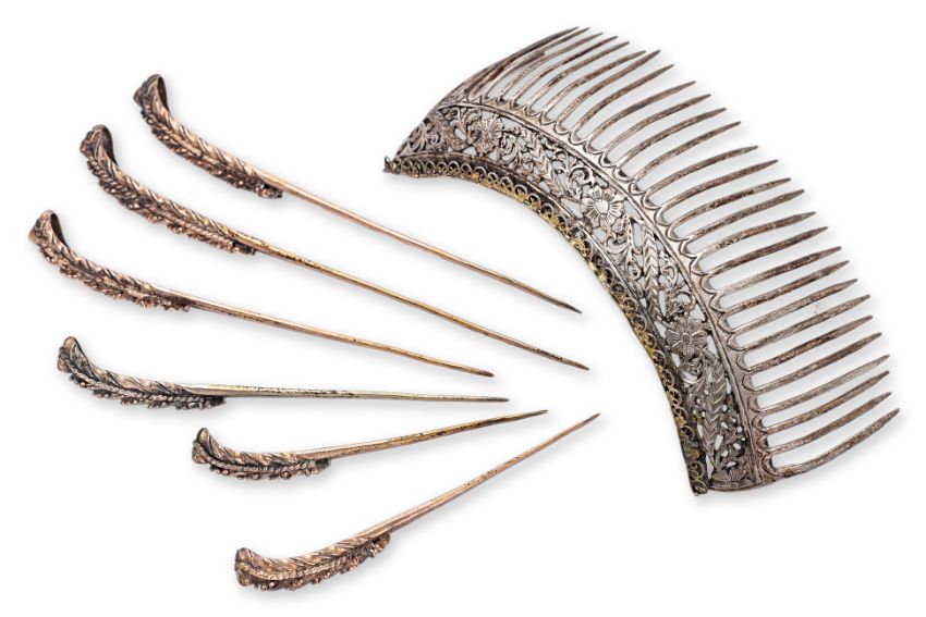 Six graduated hair pins with domed top and studded upper, triangular stamp mark to underside, and a hair comb with foliate decorated pierced upper and gilt-filigree border to the top
