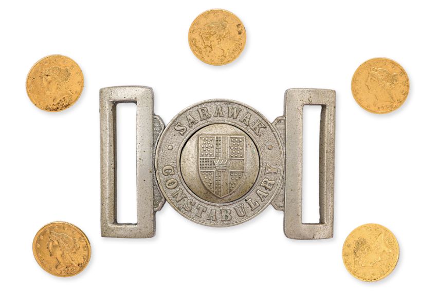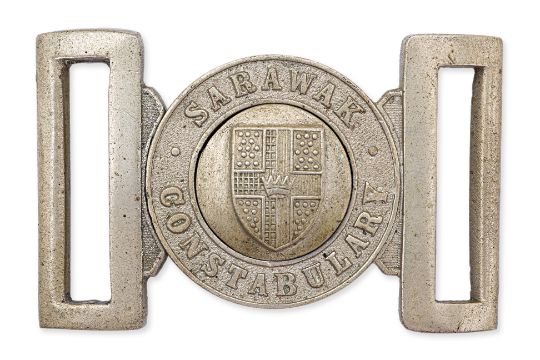 Comprising a Sarawak Constabulary two-piece belt buckle in nickel silver; and a set of five 'Modern Jewellery And Ornaments' silver-gilt tokens, all with 'PENANG' to the crown, converted to buttons