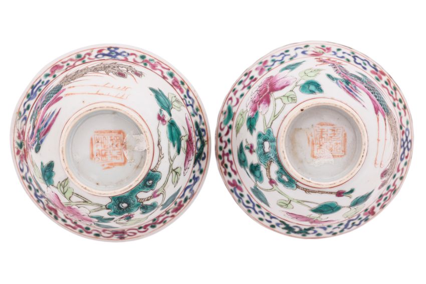White ground decorated in flying phoenix and peony, Buddhist emblem border, undulating rim, and a single peony to the well, matching seal marks to base