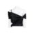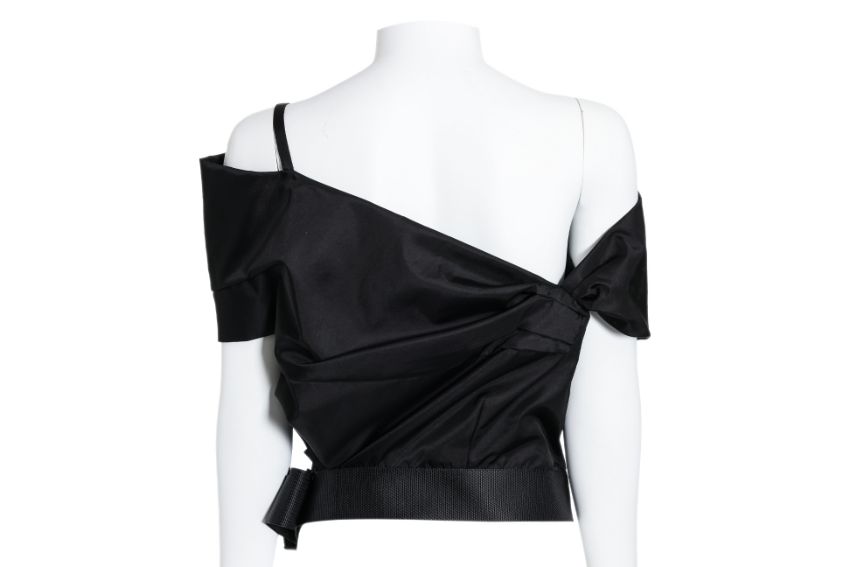 Black gabardine fabric featuring a draped silhouette with a utility-style pouch on the chest and an adjustable grosgrain waistband