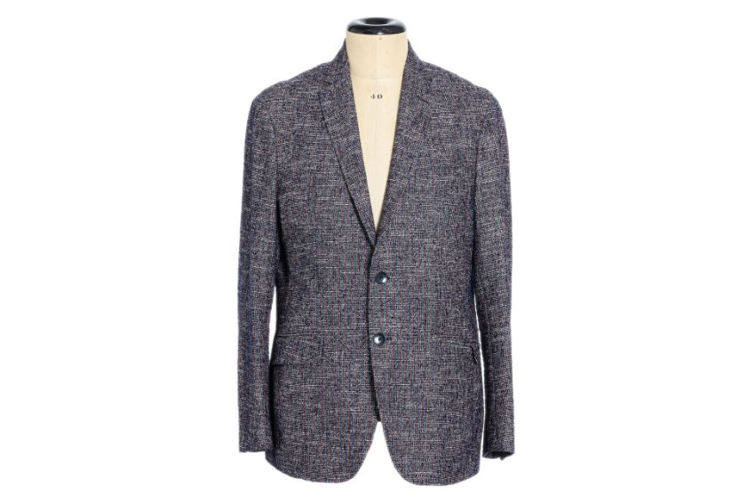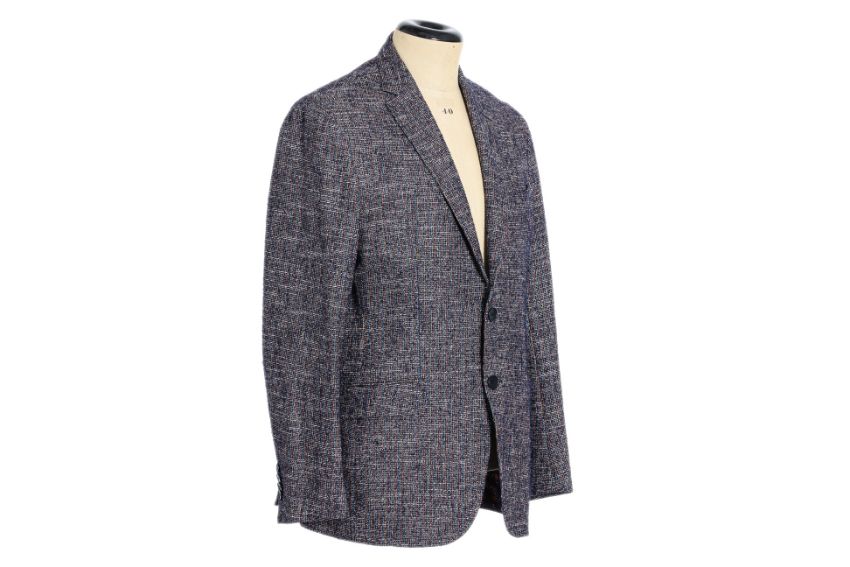 Textured blazer with a multicolored tweed fabric, featuring a two-button closure, notched lapels, and front flap pockets, the interior lining with a geometric pattern