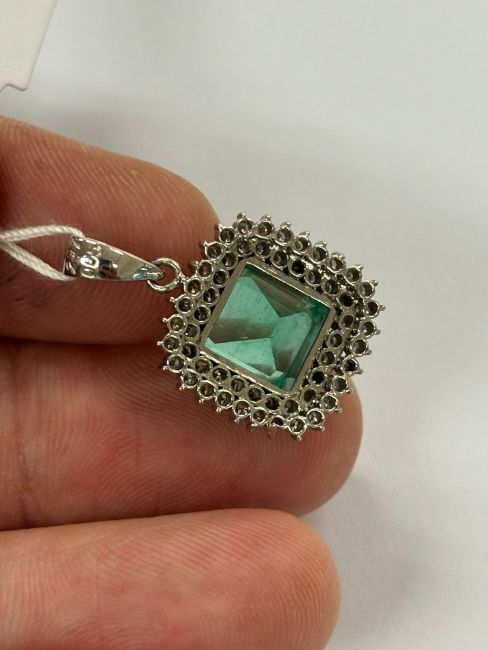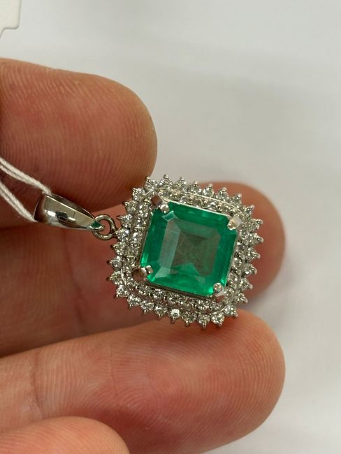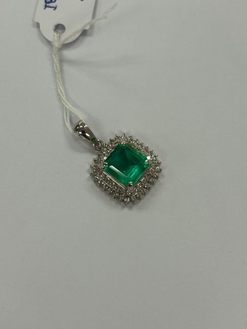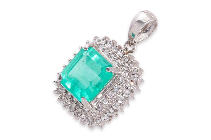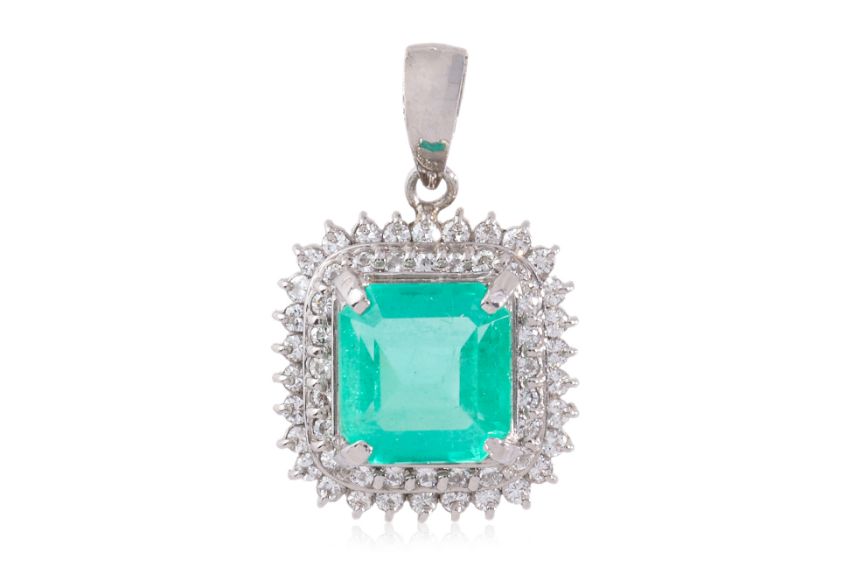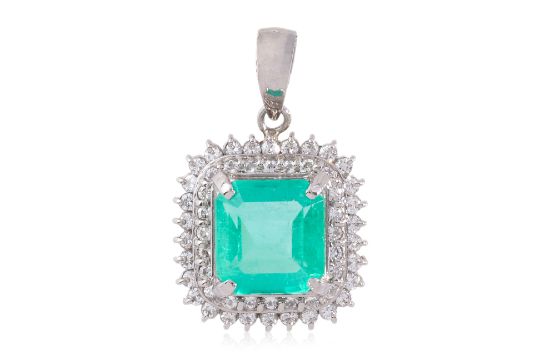 AN EMERALD AND DIAMOND 'DOUBLE HALO' PENDANT