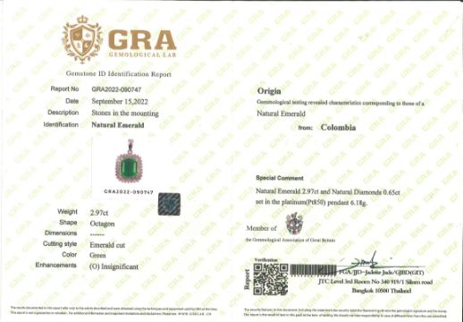 Featuring an emerald cut emerald weighing approximately 2.97 Cts (marked), mounted in a platinum setting marked 'Pt900', accented with round brilliant cut diamonds totalling approximately 0.65 Cts (marked). Accompanied with GRA Gemological Lab Report No. GRA2022-090747 dated September 15, 2022, stating that the green emerald is insignificant oiled, with characteristics corresponding to those of a natural emerald from Colombia.