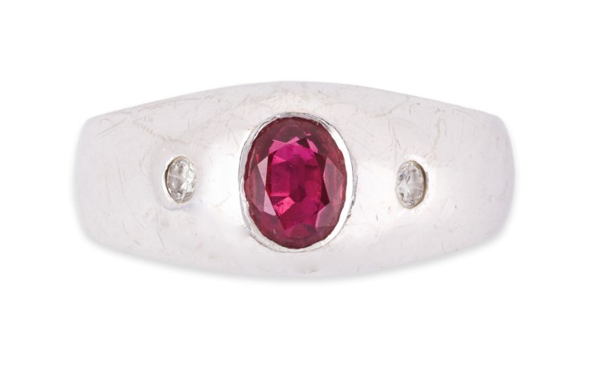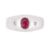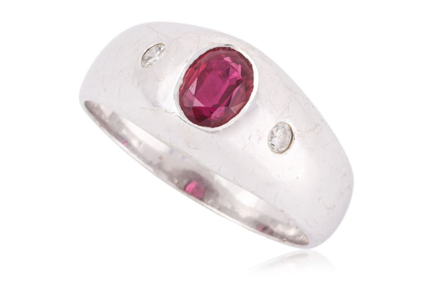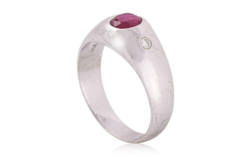 Featuring an oval cut ruby weighing approximately 0.55 Cts (marked), likely of Burmese origin, mounted in a white gold setting marked '750' for 18K, accented with two round brilliant cut diamonds totalling approximately 0.06 Cts.