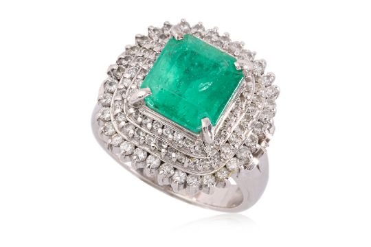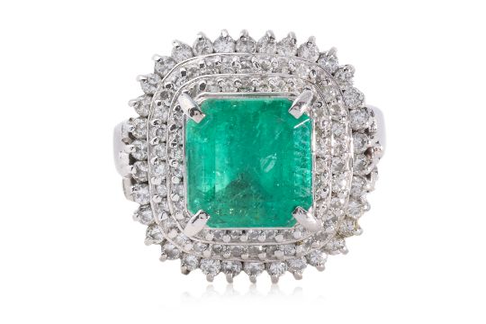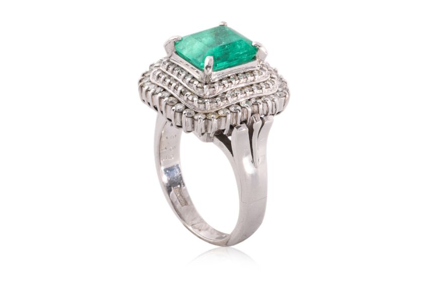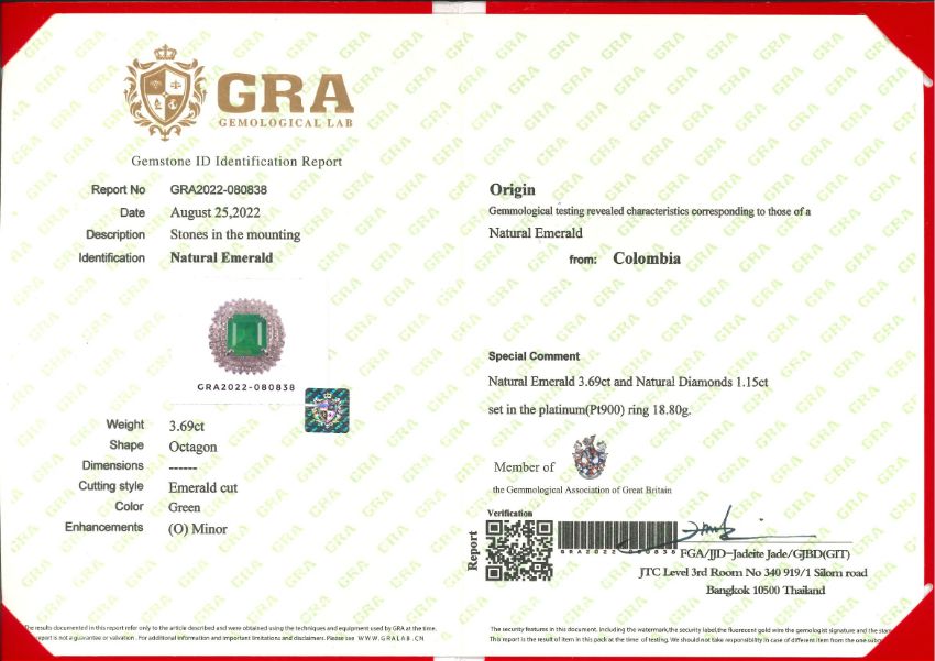 Featuring an emerald cut emerald weighing approximately 3.69 Cts (marked), mounted in a platinum setting marked 'Pt900', accented with round brilliant cut diamonds totalling approximately 1.15 Cts (marked). Accompanied with GRA Gemological Lab Report No. GRA2022-080838 dated August 25, 2022, stating that the green emerald is minor oiled, with characteristics corresponding to those of a natural emerald from Colombia.