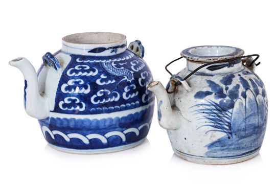 The first example with three fine hairlines to the rim, a chip to the tip of the spout; the smaller example with a chip to the cover and a hairline running over the junction of the spout and body