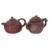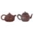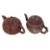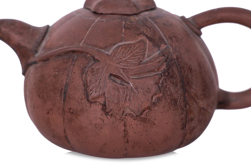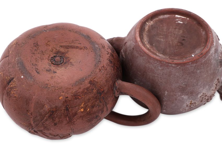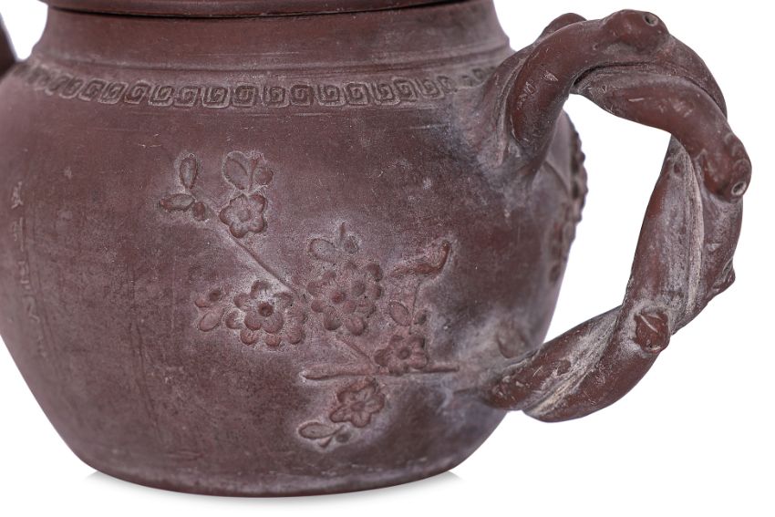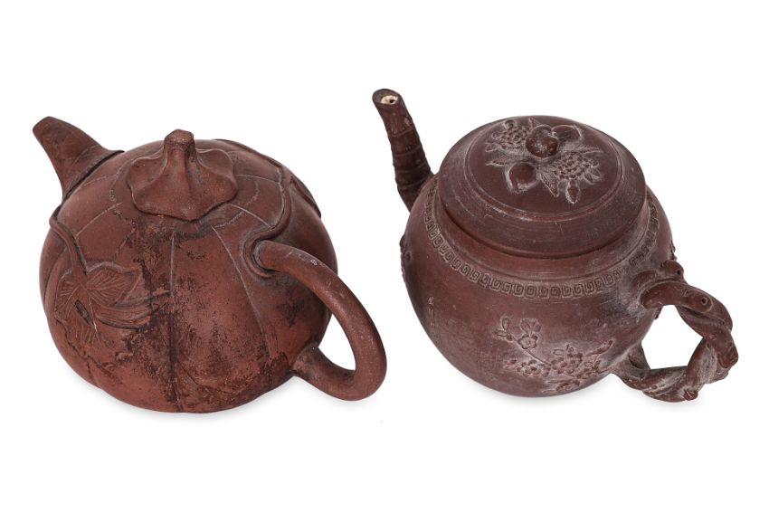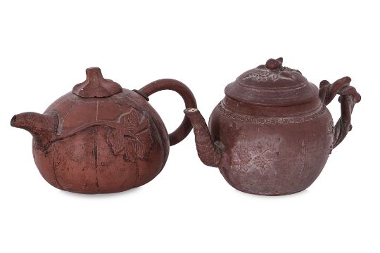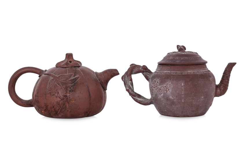 One example decorated in plum blossom and bamboo with twisted branch handle and bamboo stalk spout, key fret border and peach finial to cover, inscription to side and seal marks to base. The other in gourd form with vine leaf to each side and stem cover.