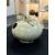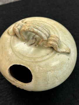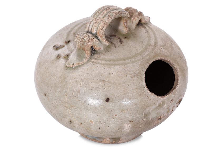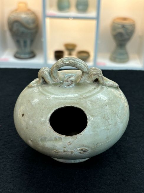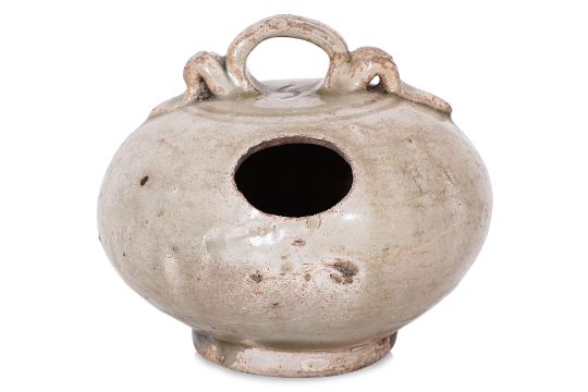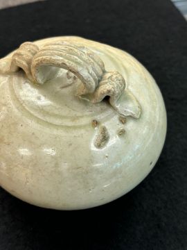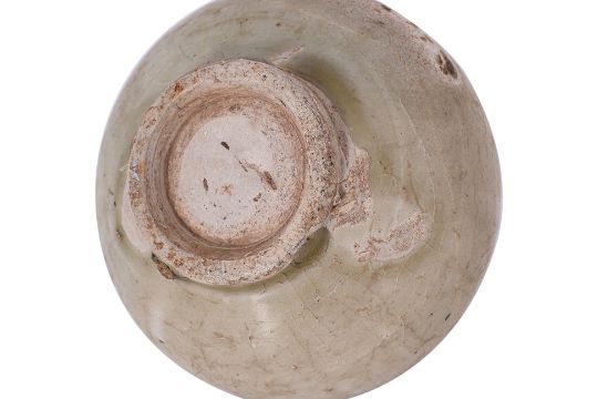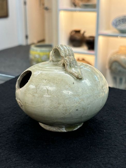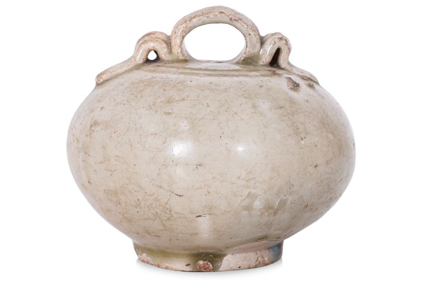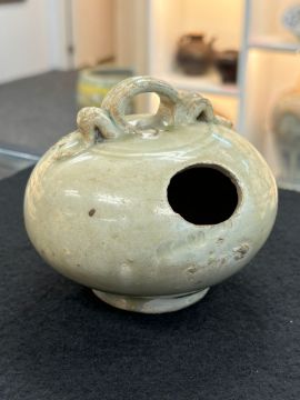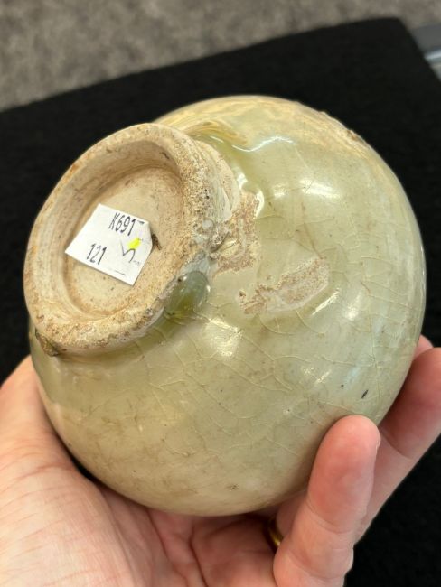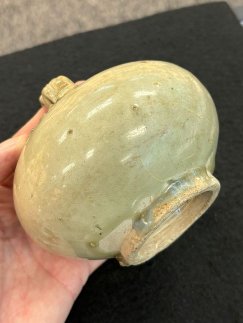 12th-14th century, globular pot with strap handle and oval hole, transparent pale-green glaze, upright recessed unglazed foot