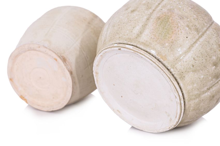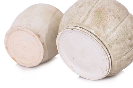 11th-13th century, small ewer with eight lobed body, makara spout, parrot mount, and lotus petal collar, transparent pale-green glaze. A white glazed jar with lobed sides and four boss mounts to the shoulders, circular overhanging cover