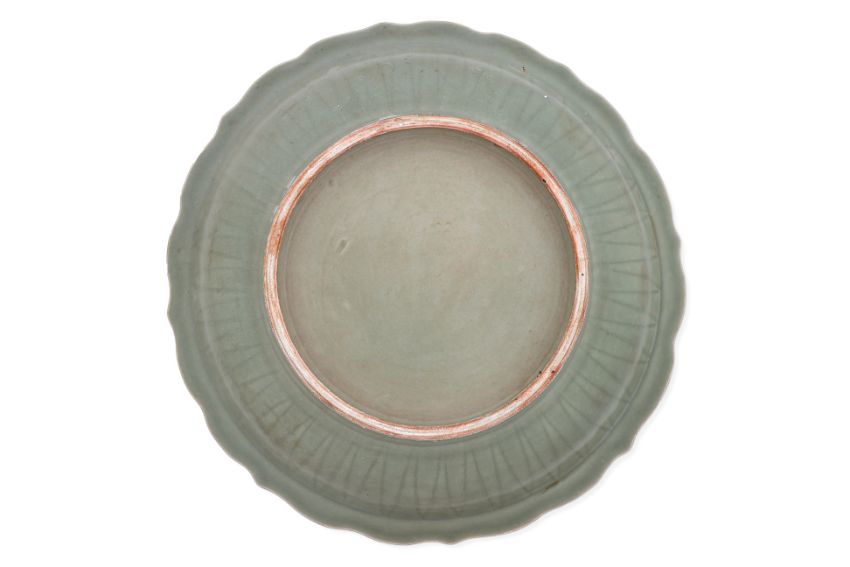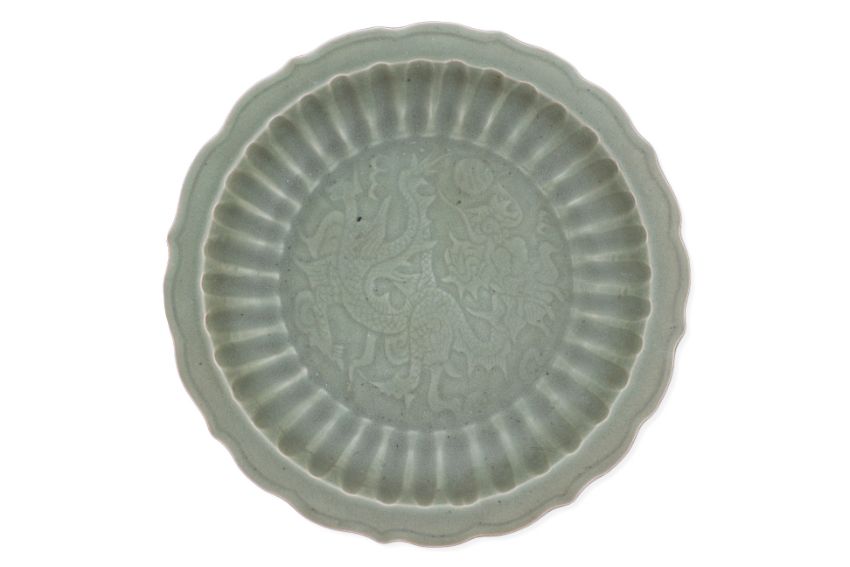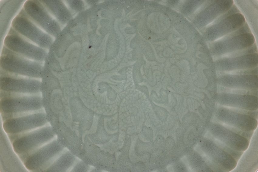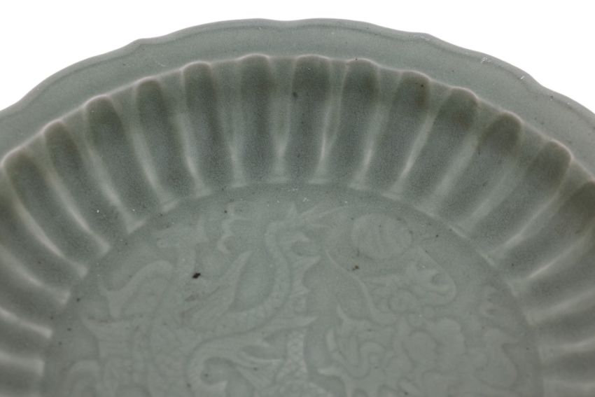 Yuan/Ming style but probably later, carved in shallow relief to the centre with a coiled dragon with a pearl, within a fluted border and barbed rim, exterior incised with lotus petals, base glazed apart from the foot rim