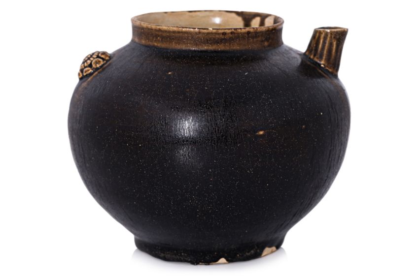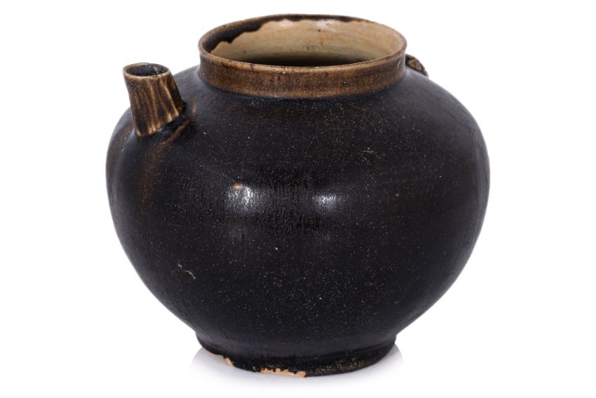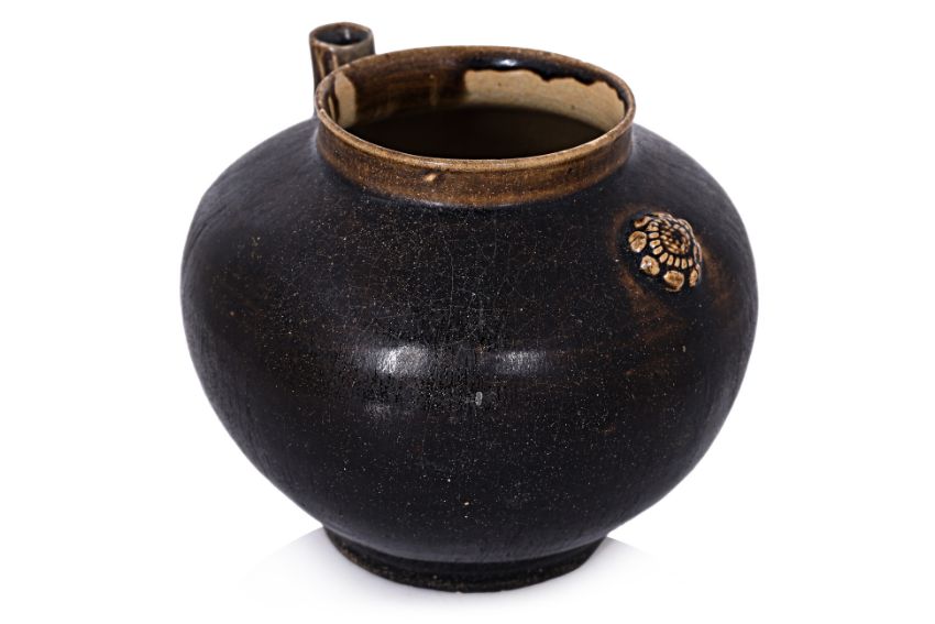 13th-14th century, globular ewer with small straight spout, moulded rosette suggestive of spout, brown glaze which runs olive across the thin mouth rim and spout