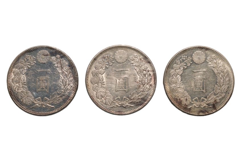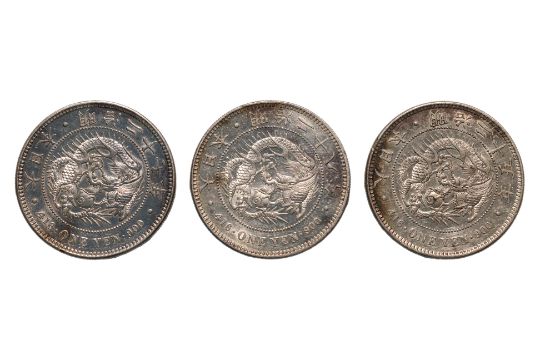 Dragon within a beaded circle, legend in English and Japanese, reverse with chrysanthemum flower and Japanese characters within ribbon tied wreath, all good condition approximately AU
