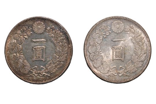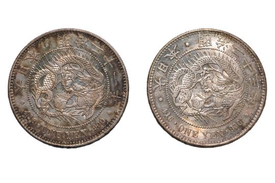 Dragon within a beaded circle, legend in English and Japanese, reverse with chrysanthemum flower and Japanese characters within ribbon tied wreath, about XF-UNC