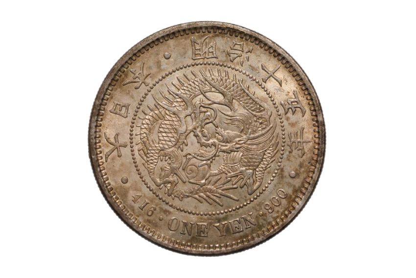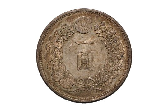 Dragon within a beaded circle, legend in English and Japanese, reverse with chrysanthemum flower and Japanese characters within ribbon tied wreath, about AU-UNC