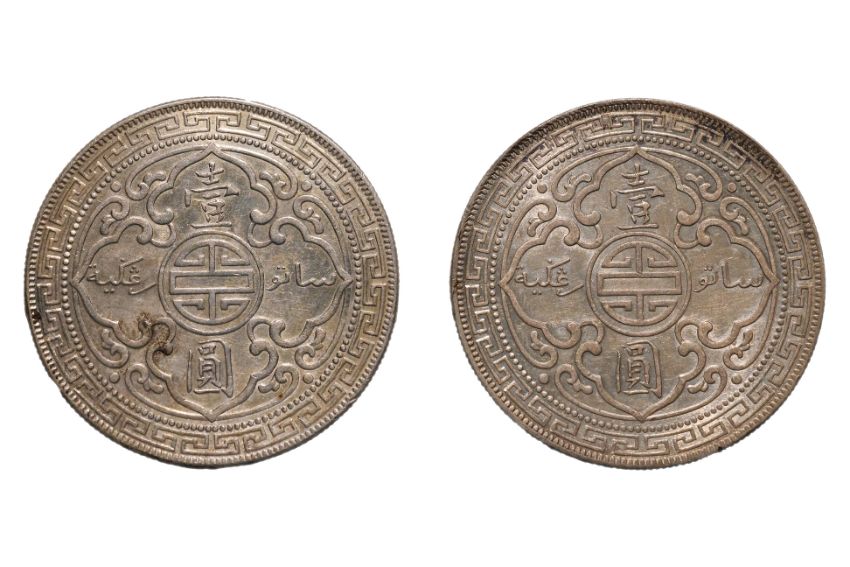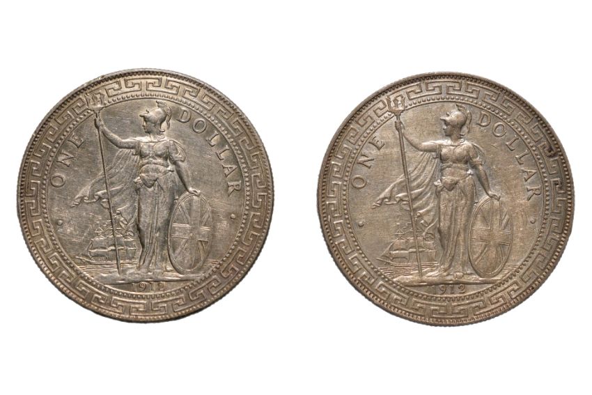 Britannia standing holding a trident and a shield, date below, reverse with Chinese characters and Jawi script, B mintmark to trident, both approx AU