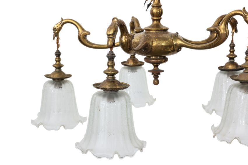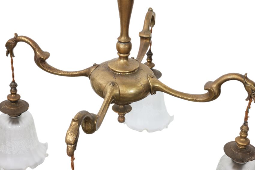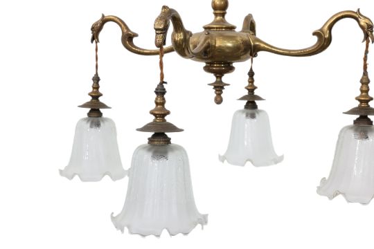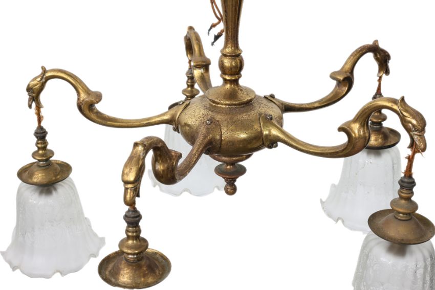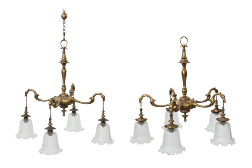Circa 1900, in the Arts and Crafts taste, of matching design, one five light and one four light example, the scroll branches with bird head terminals, etched glass shades with crimped rims