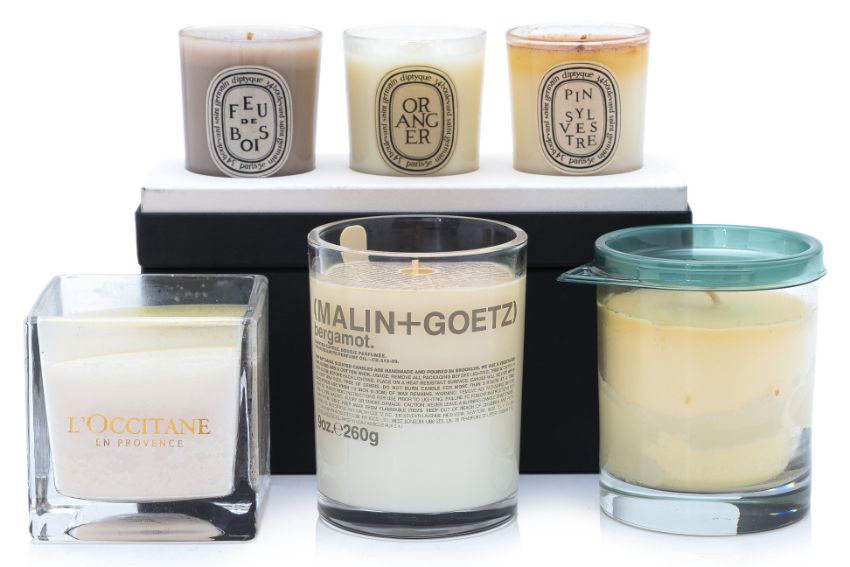 Comprising: three L'Occitaine examples; a Diptyche three candle set; a Rigaux example; a Ralph Lauren Amalfi Coast candle; Aveda; and a Malin + Goetz example, all unused and all with boxes apart from one L'Occitaine example
