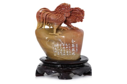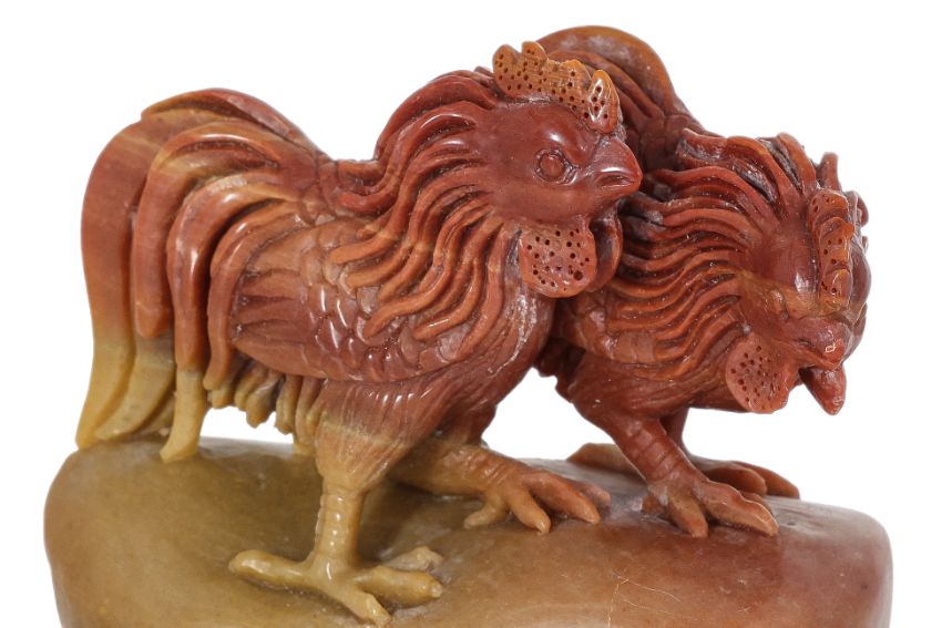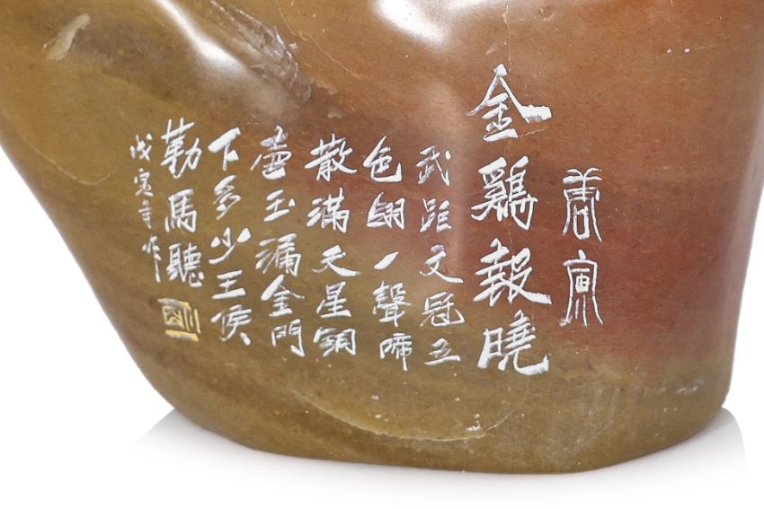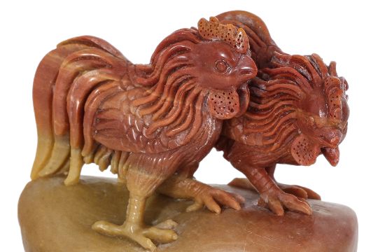Two cockerels standing on polished stone, inscription to one side, undecorated flat base