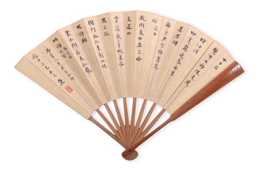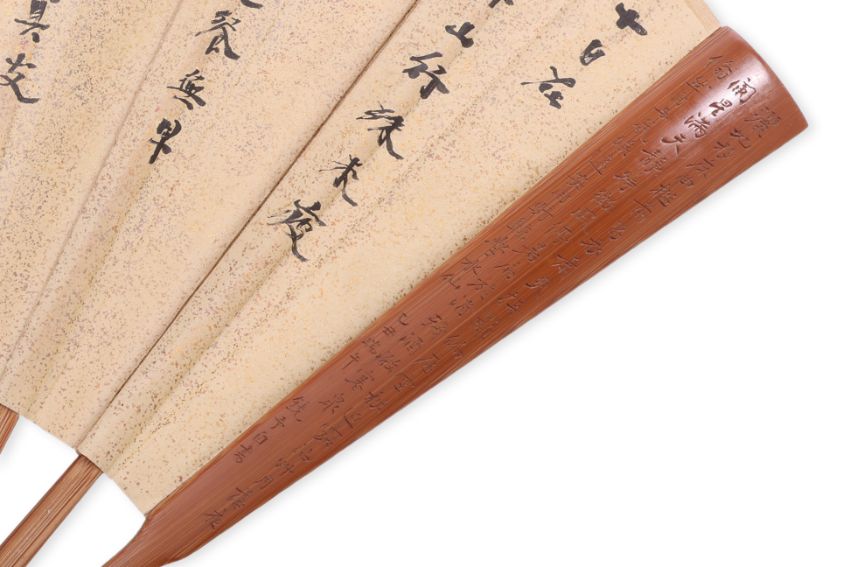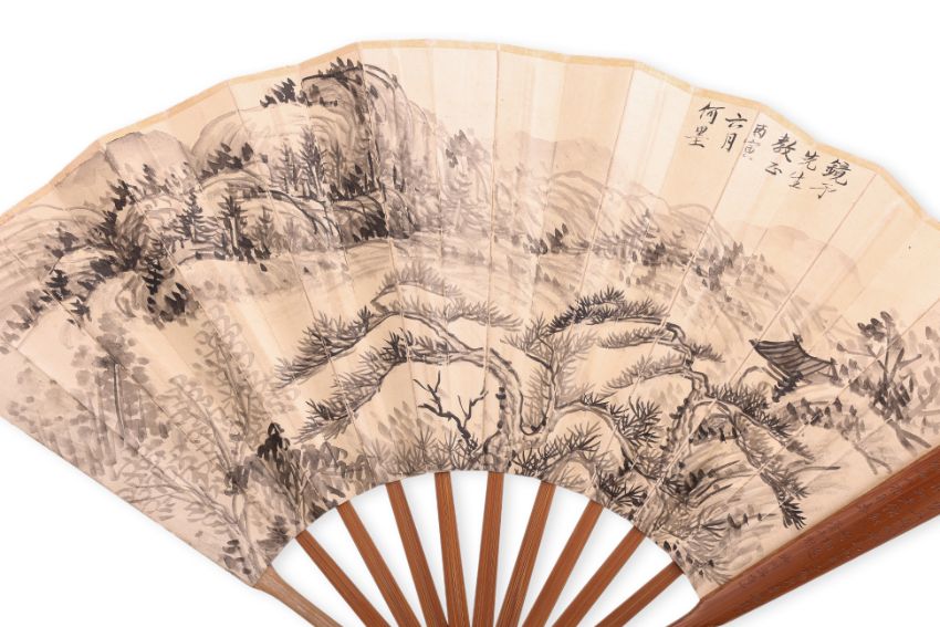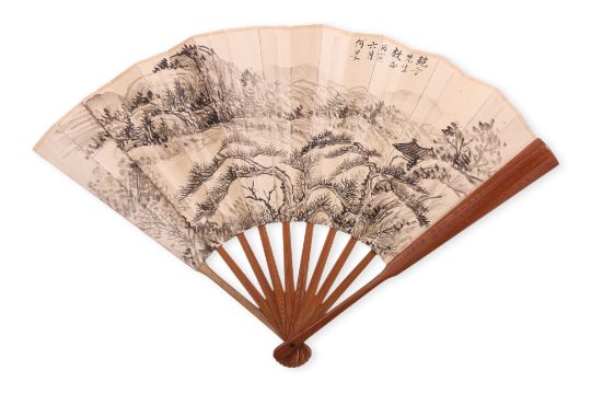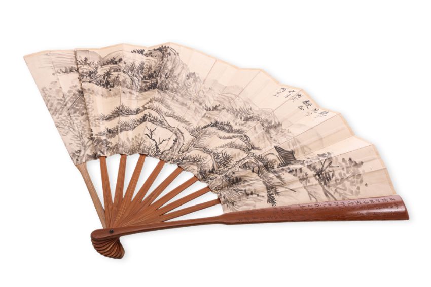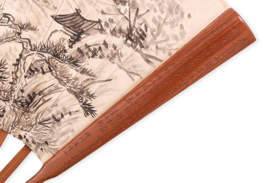 Landscape painting and poem to reverse, carved poem to bamboo handle, dated 1985/86, signed Jing Yu