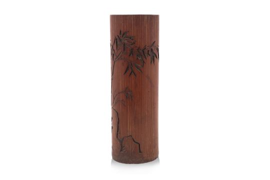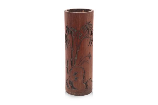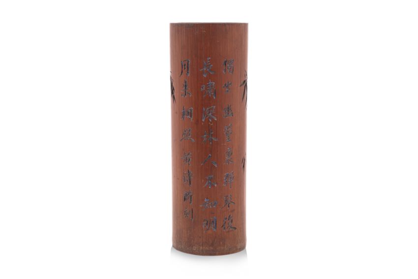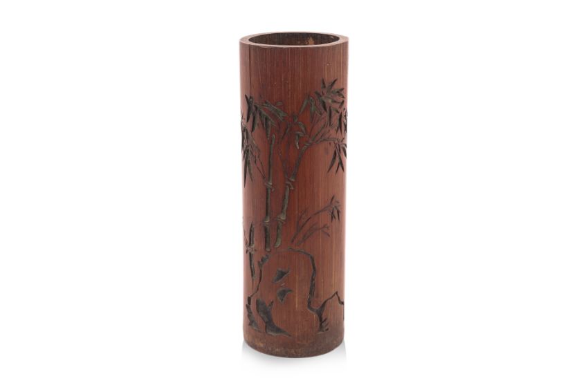 Carved with bamboo stalks growing from behind a rock, the reverse with calligraphy inscription