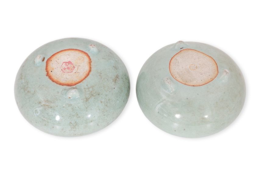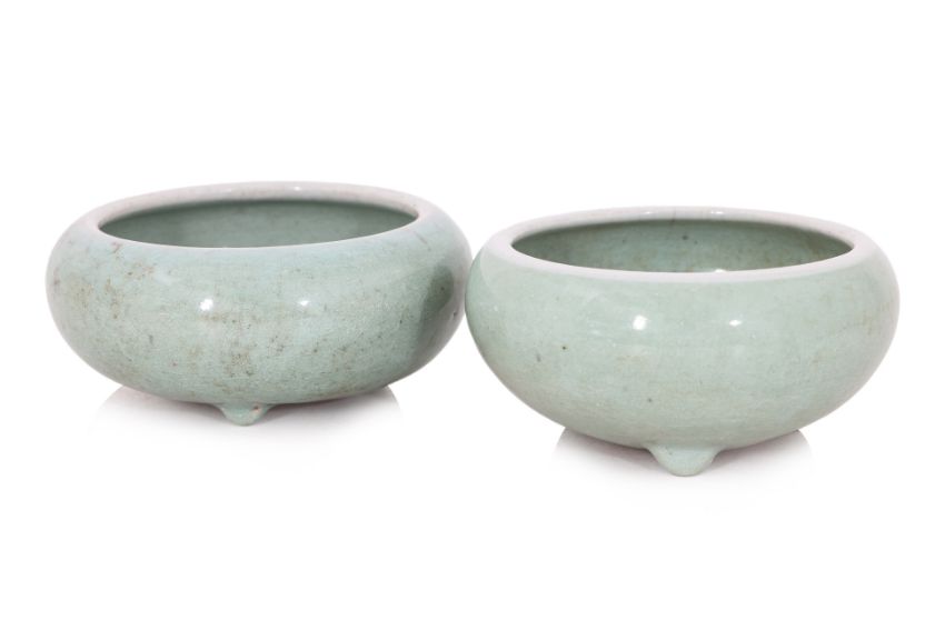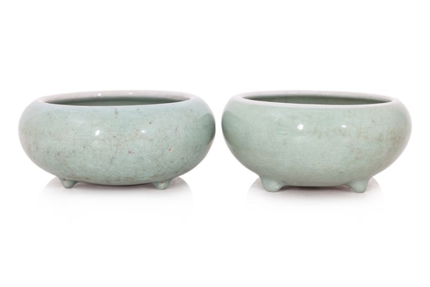 Condition Information: Both with some age related light wear, one with some staining to the crackle on the interior, scuffing to the glaze on the feet