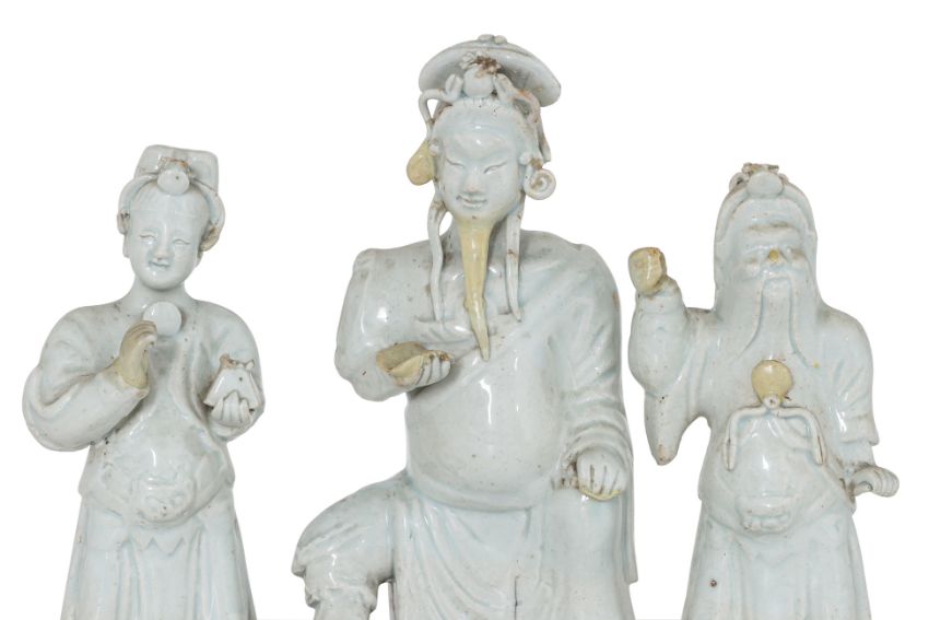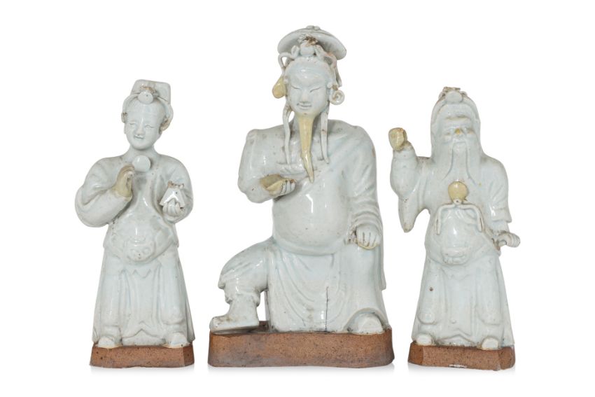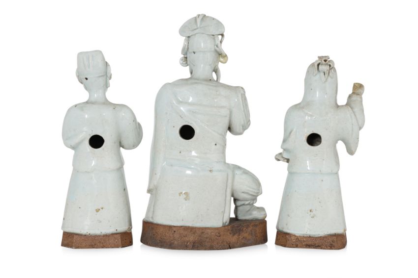 Yuan-Ming dynasty, comprising a figure of seated man with right leg raised (presumably Guandi), and two other figures, all with unglazed burnished biscuit base