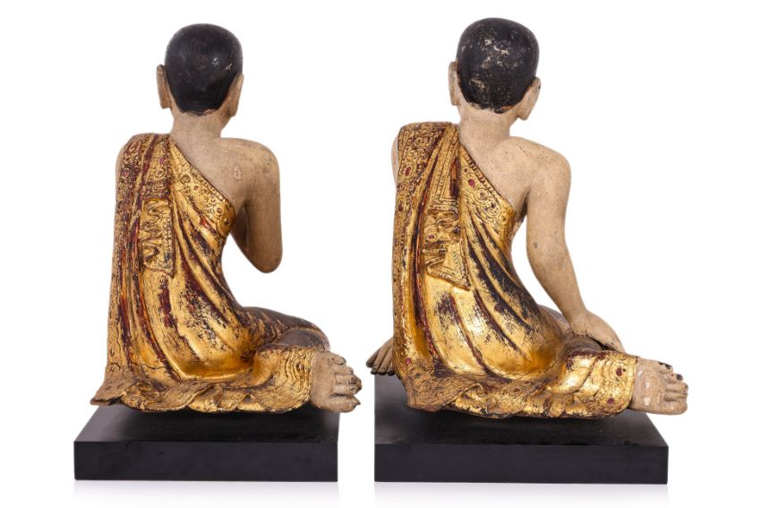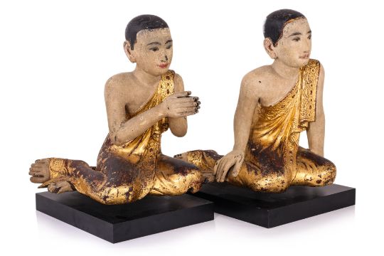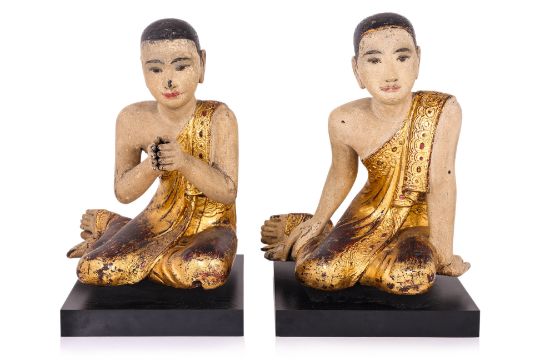 19th Century, wood with lacquer, stucco and gilding, one example modelled kneeling with hands clasped, the other similarly kneeling with hands resting by side, on contemporary black wooden base