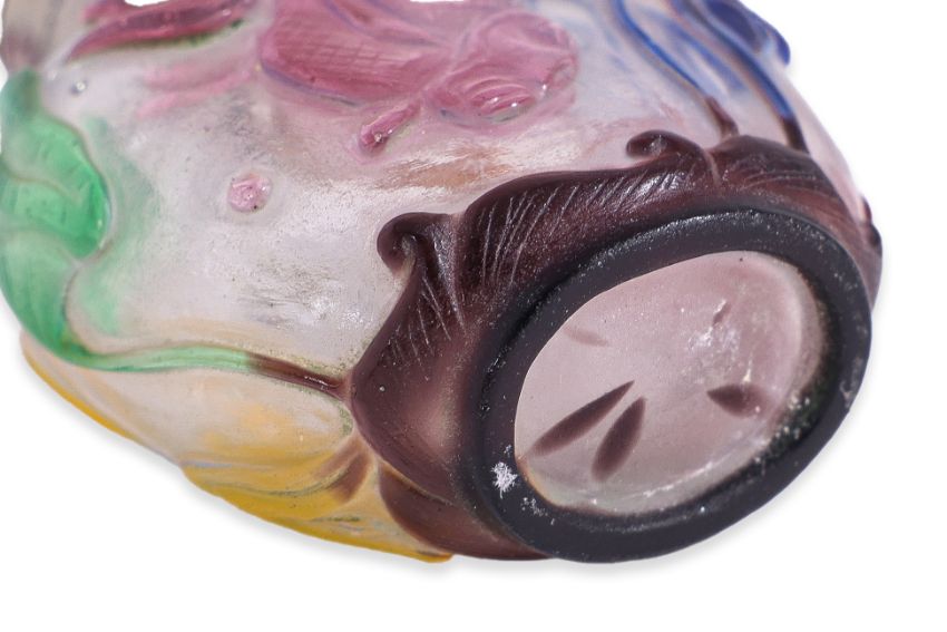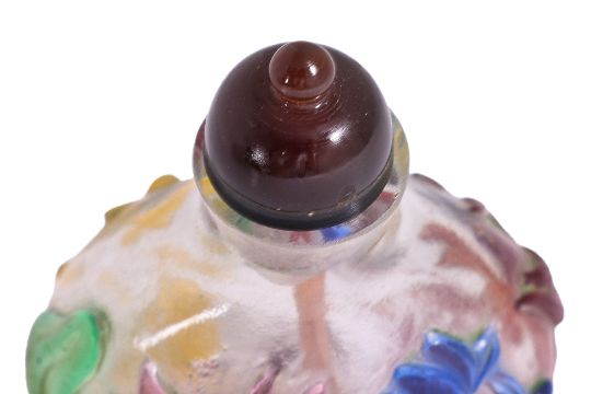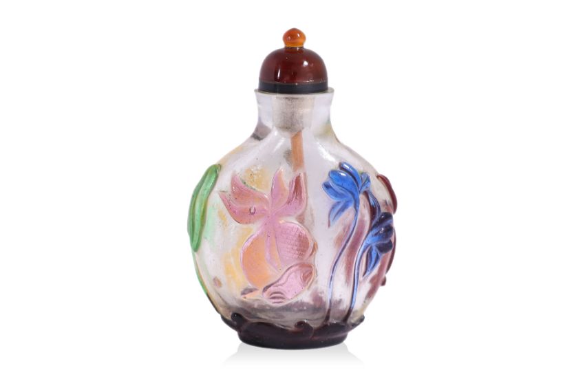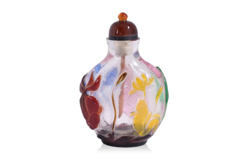 Circular form bottle decorated in relief carved koi fish and lotus, purple overlay foot, carnelian stopper, probably 19th century