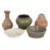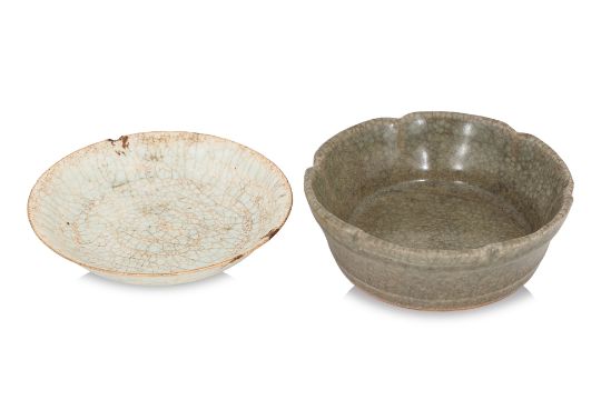 Comprising: a shaped circular brush washer, with pale green crackled glaze; a small bottle vase; a shallow qingbai circular dish; a celadon baluster jarlet; and a pear shaped water dropper