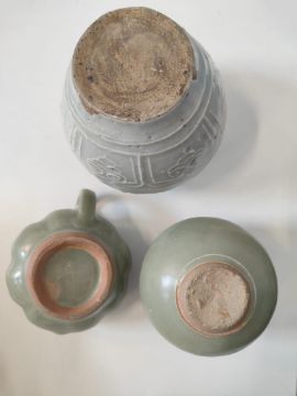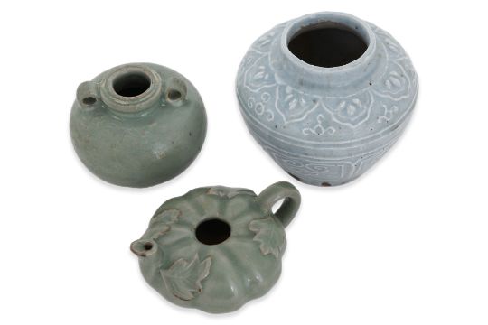 A CELADON JARLET, A SMALL TEAPOT AND PALE BLUE JAR