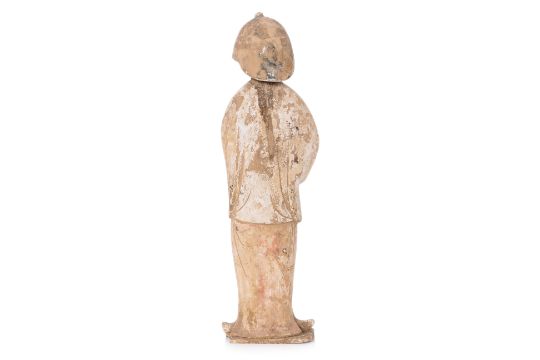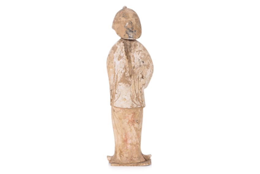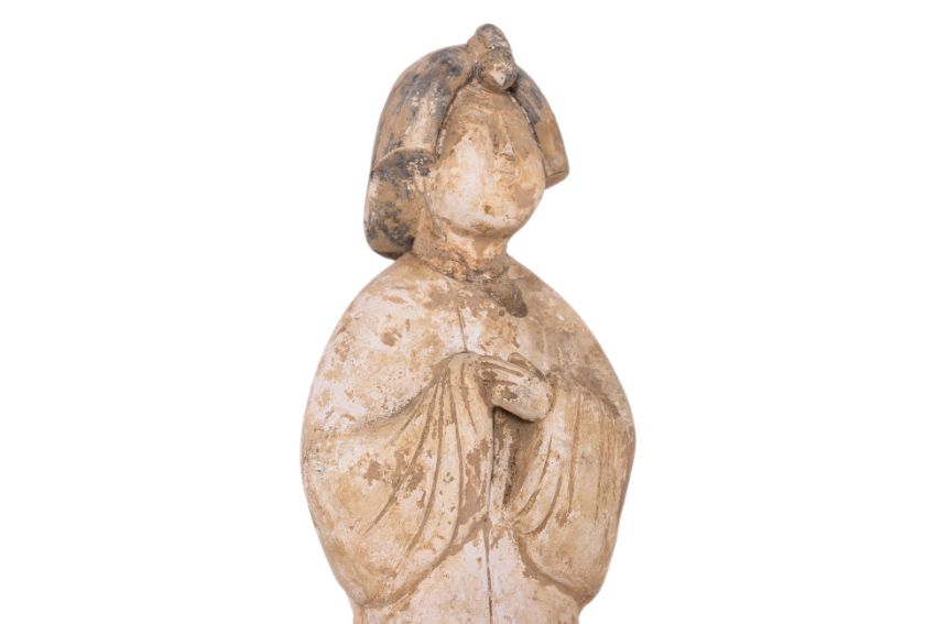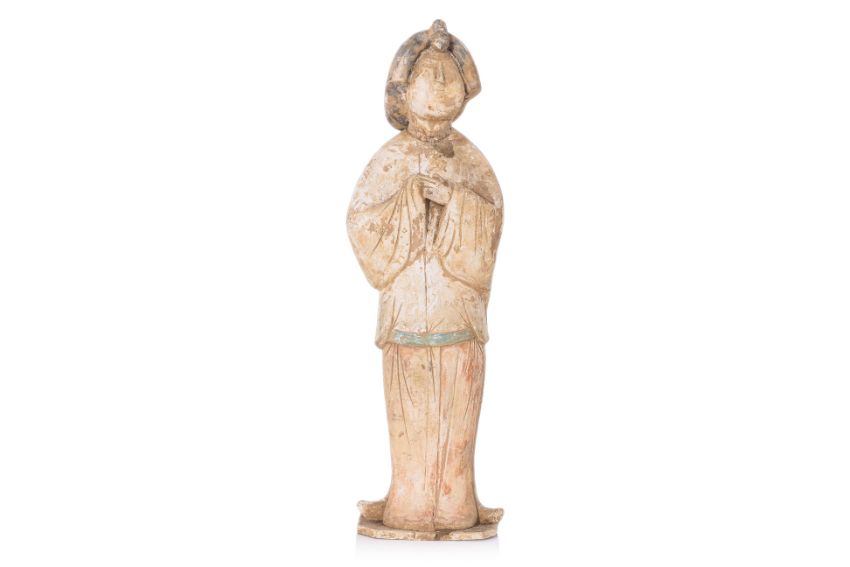 In the Tang style and likely of the period, dressed in flowing robes , her hands clasped at her chest, on shaped square base, with remains of pigment