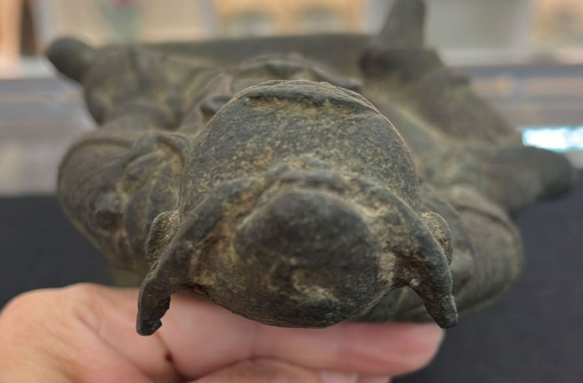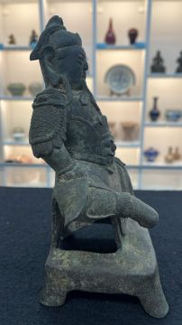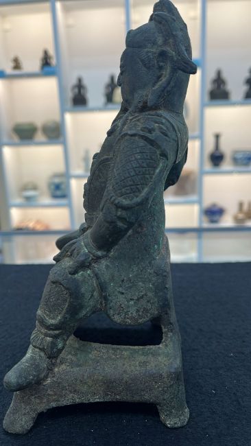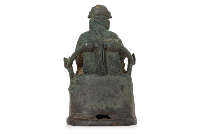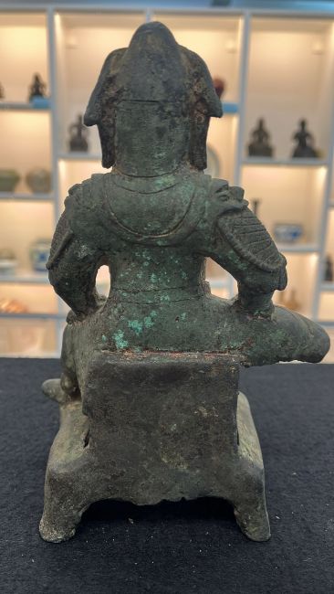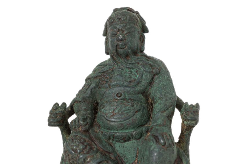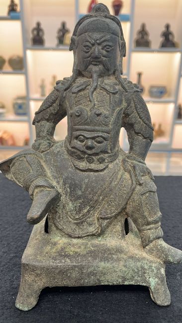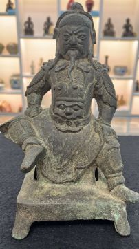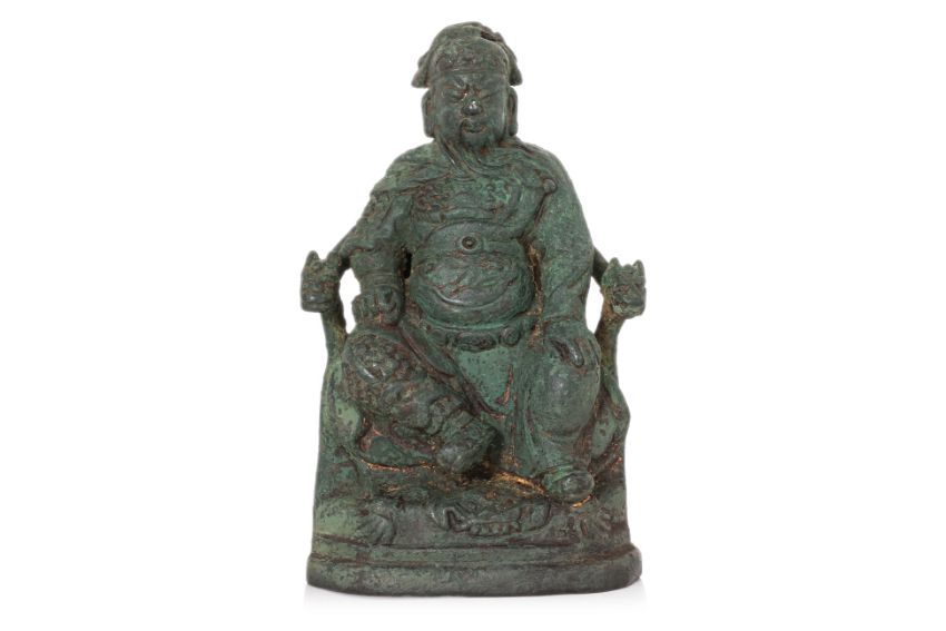 A BRONZE FIGURE OF GUANDI SEATED ON A HORSEHOE THRONE
