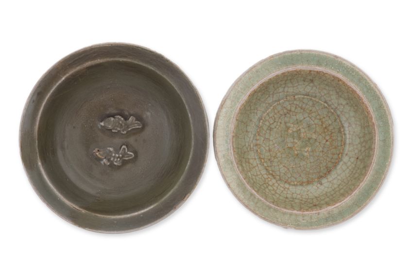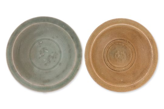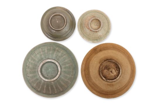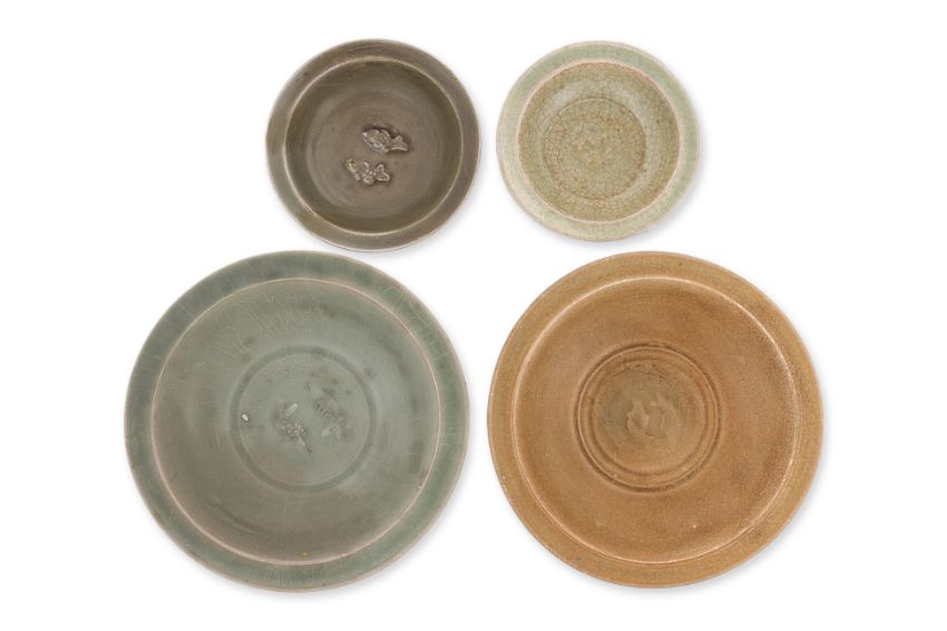 Song-Ming dynasty, two larger dishes, one with gaze burnished orange-brown with unglazed base, the other green with glazed base, two smaller examples, of with crisp outline of fish and lustrous glaze, the second example pale green with crazing