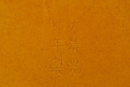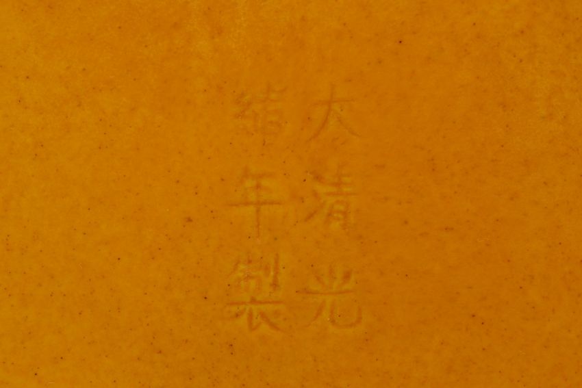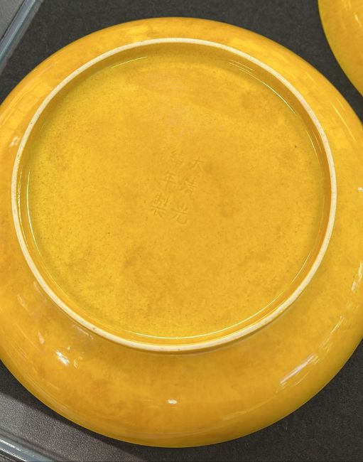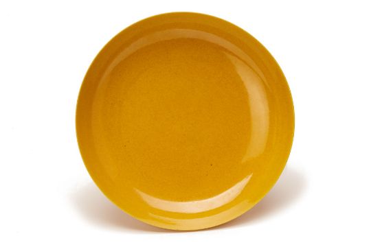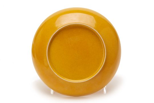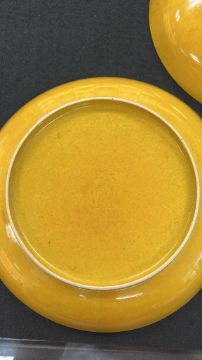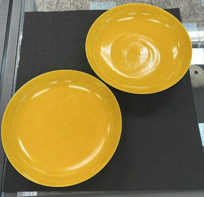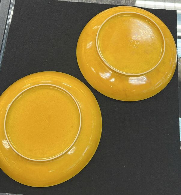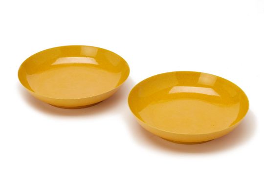 A PAIR OF MONOCHROME YELLOW GLAZED PORCELAIN DISHES