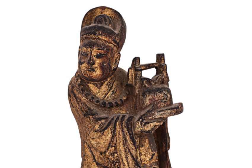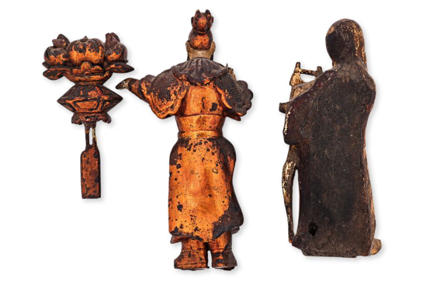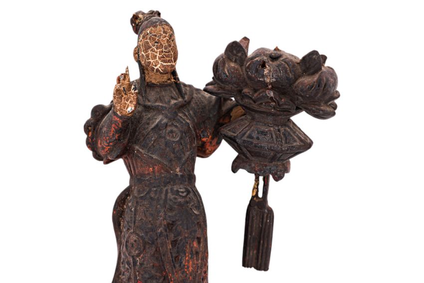 Both likely mounts for furniture or a shrine, one figure holding an offering; the other with his right hand raised and another section of fruit offering, late 19th/early 20th century