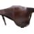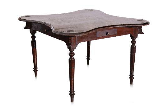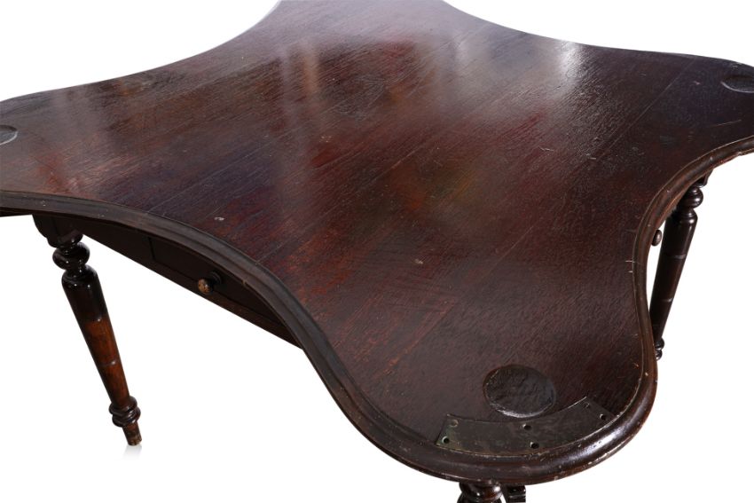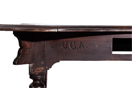 Dark-stained wood, scalloped-edge top with metal plates secured by screws, turned legs with carved details, originally four drawers with one missing, "U.G.A." engraved on one side