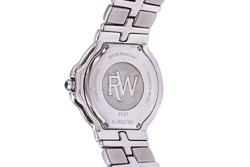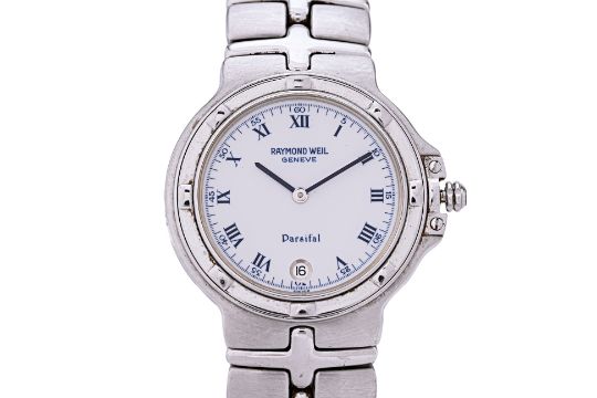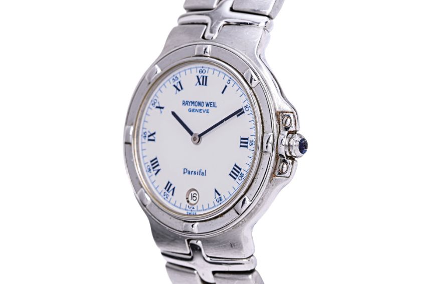 Swiss, quartz movement, white dial, blue Roman markers and hands, date aperture, stainless steel case and band, 35mm dimeter, ref. 9191 A360 748