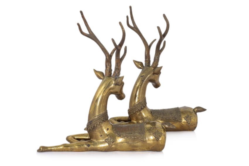 Modelled sitting on flat base and facing backward, patterned saddle, necklace and mounts