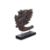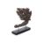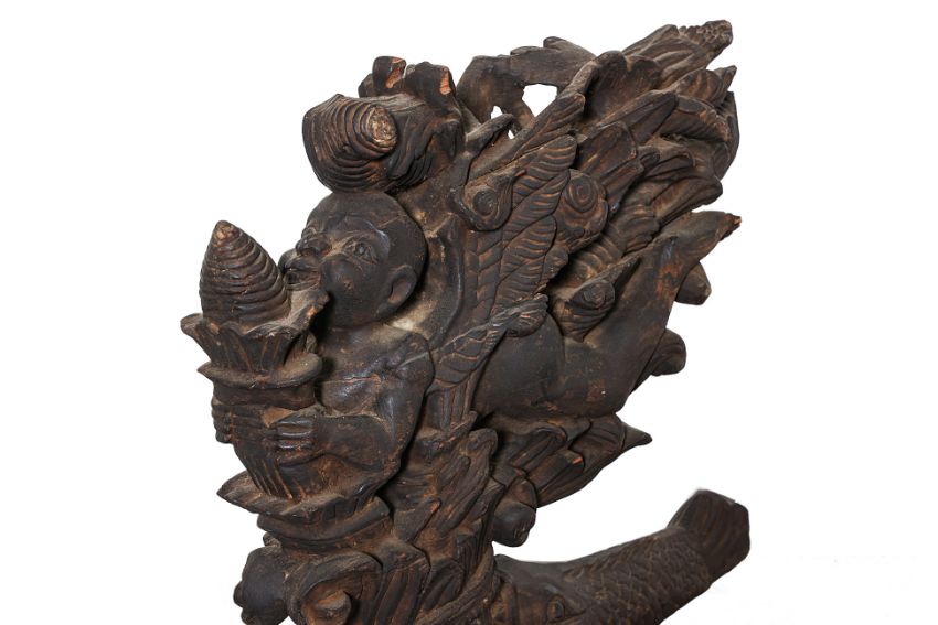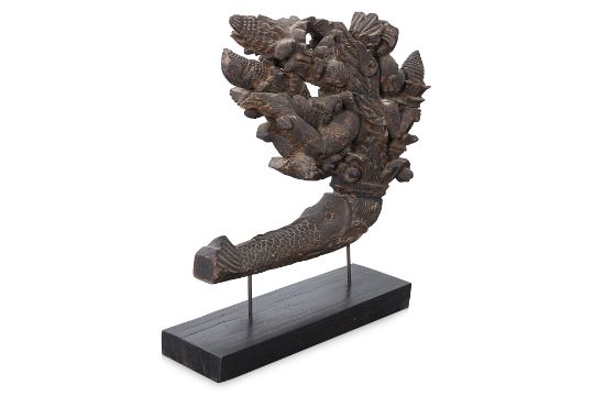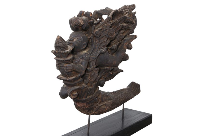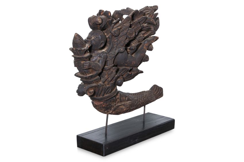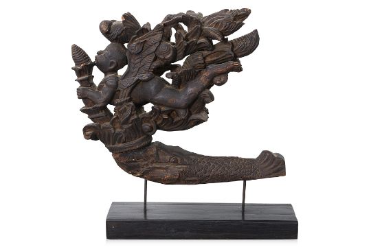 Hardwood carved as a an aquatic creature with boy and foliage emerging from its mouth, on hardwood stand